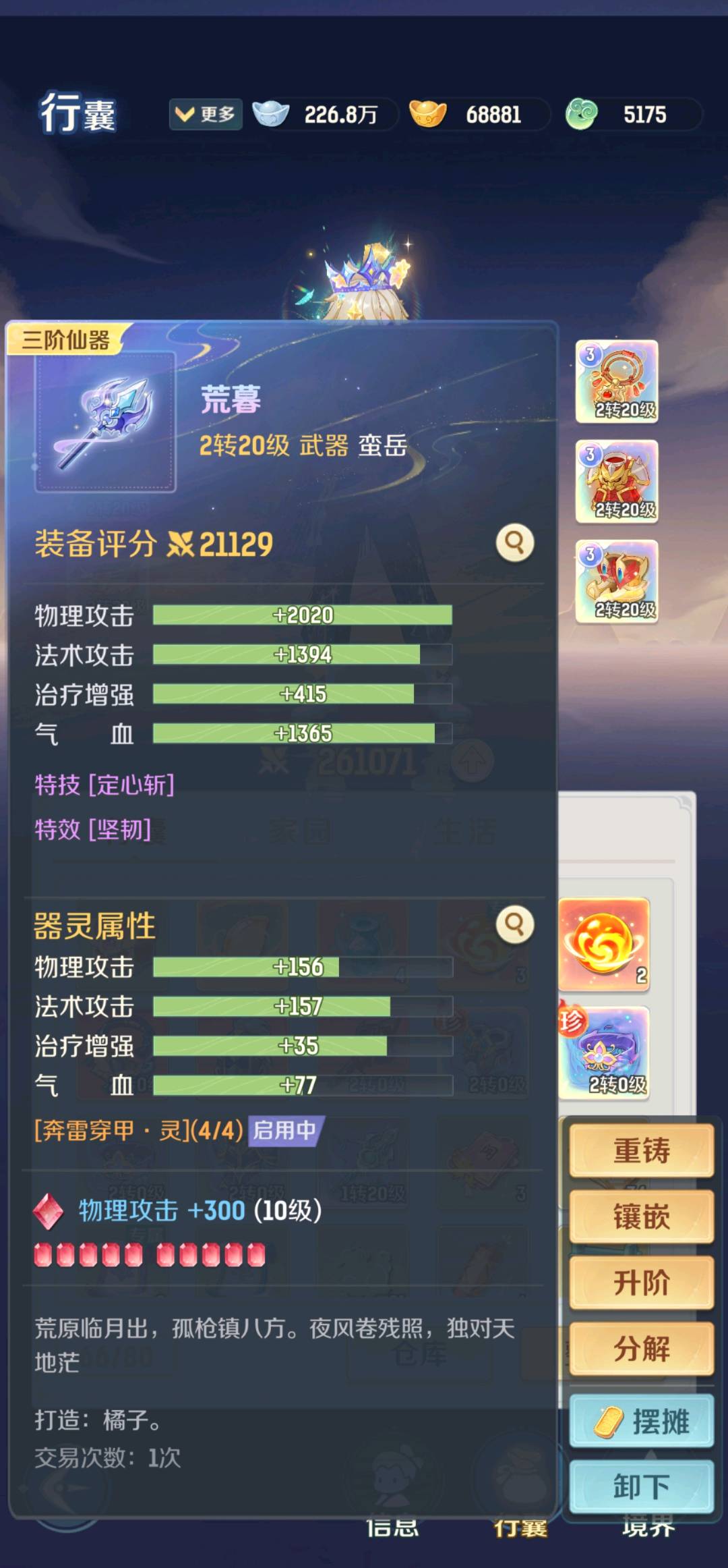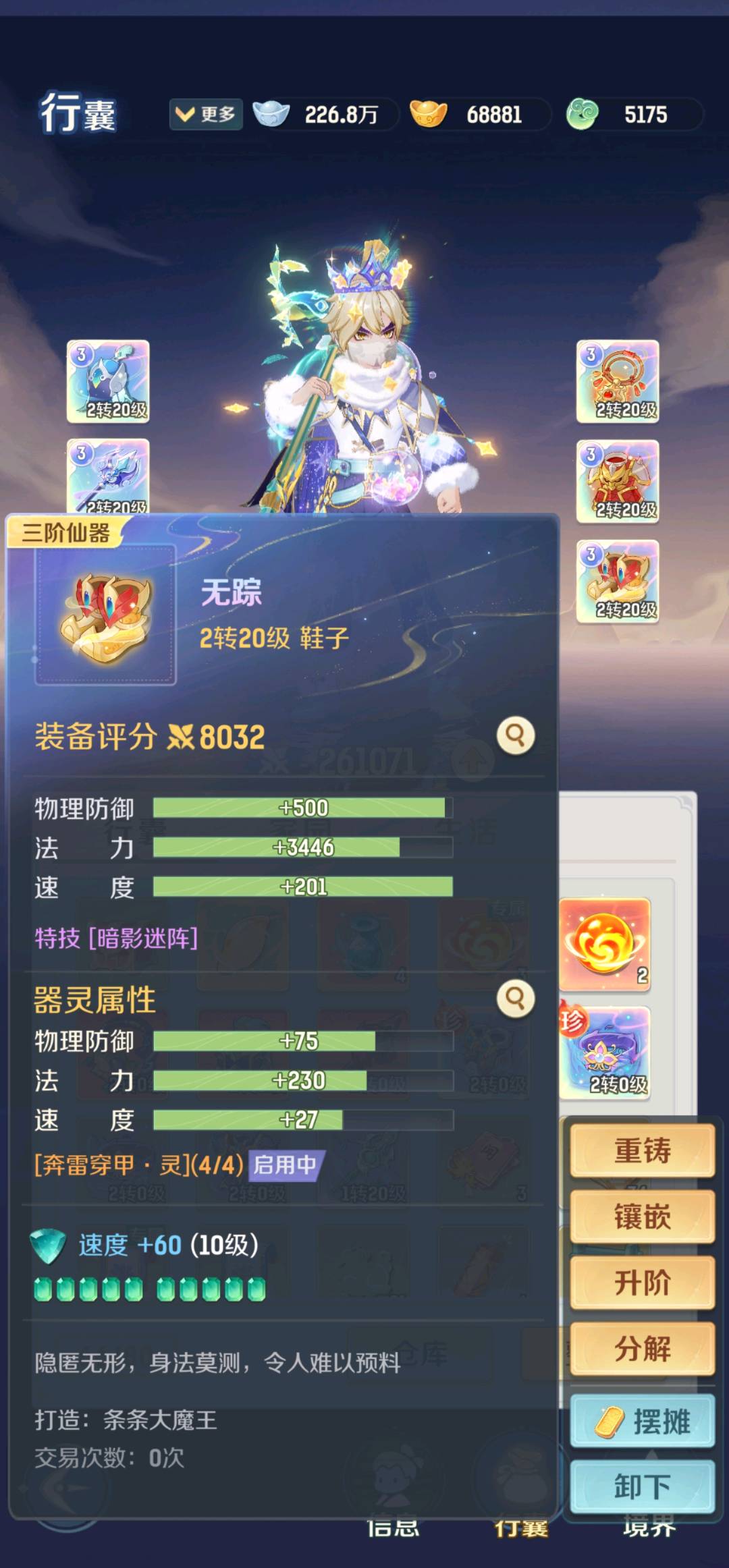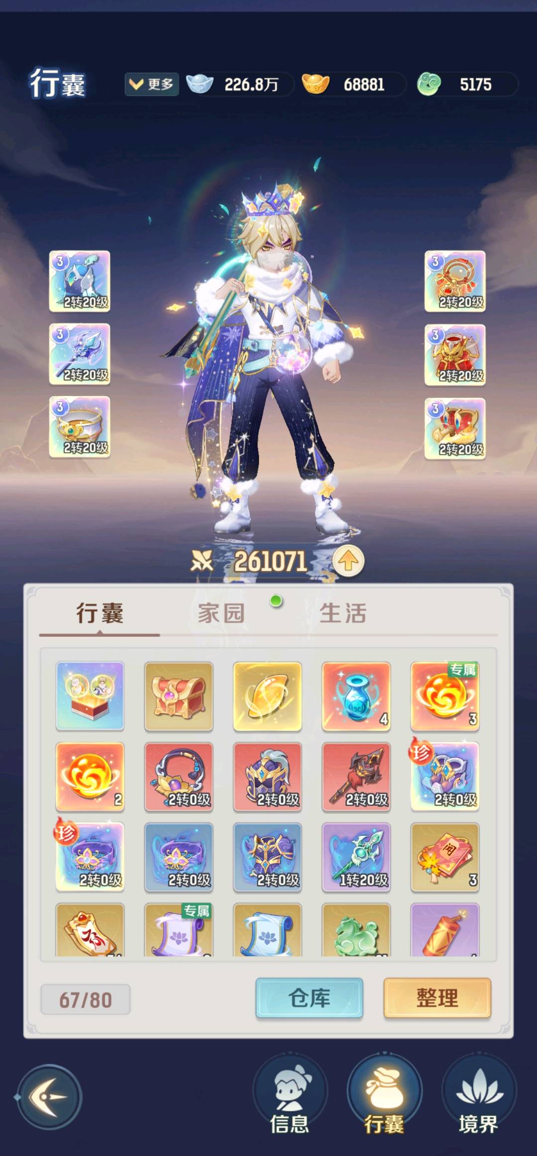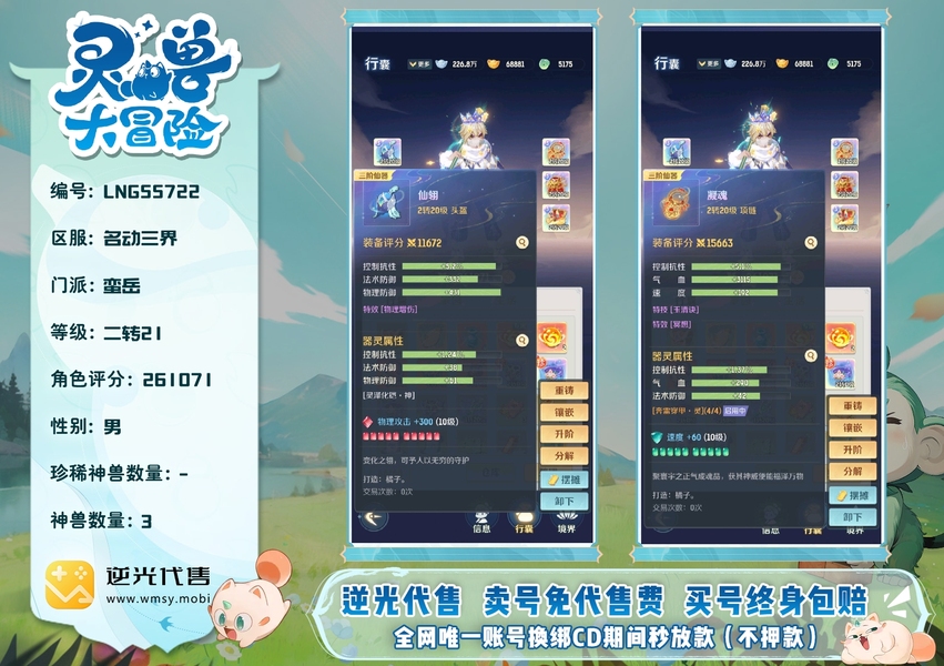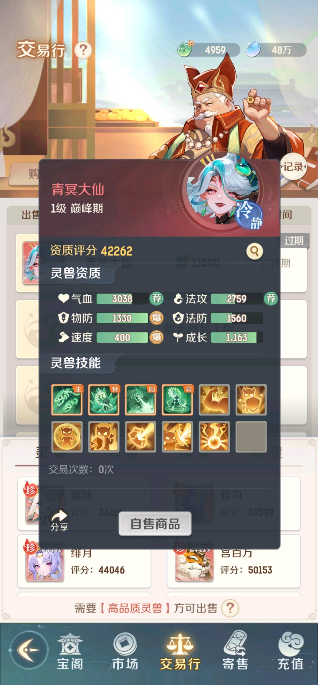 还有48万如意点,区第一蛮子。三神满三阶套装备毕业,4套成品物理暴击毕业心法,4件套器灵,6件套也有两件。满觉醒成品9技能老虎,寒星仙子,8技能狗,寒星,鹿7技能蛇 一共10个觉醒好的宝宝。该买的都买了,上手直接玩什么都不用买,细节拉满。