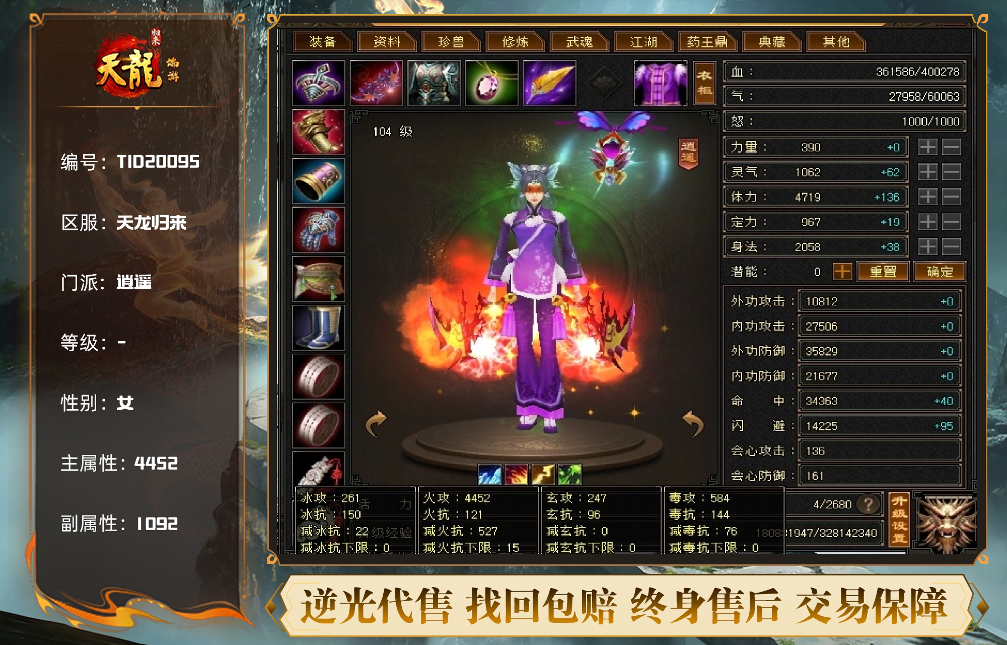 40万血逍遥,6体6属、美女一手号、总消费超10万带极品5300附体3十宝宝,可小刀,不接受屠龙刀、金币还有3万多,元宝还有3万多!
