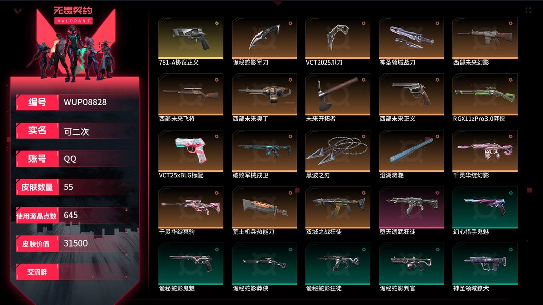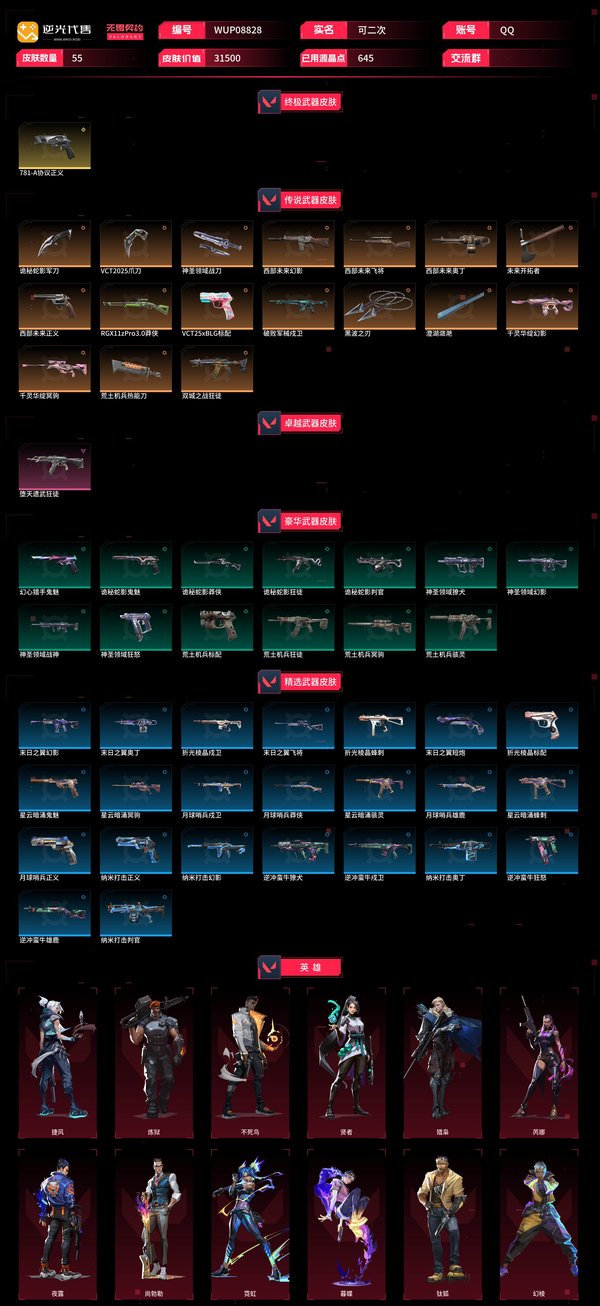 【WUP08828】 | 卓越武器数量:1 | 皮肤资产价值:31500 | 传奇武器数量:17 | 终极武器数量:1 | 白银 | 西部未来奥丁、末日之翼奥丁、纳米打击奥丁 | 神圣领域狂怒、逆冲蛮牛狂怒 | 逆冲蛮牛雄鹿、月球哨兵雄鹿 | 星云暗涌蜂刺、折光棱晶蜂刺 | 神圣领域战神 | 诡秘蛇影鬼魅、幻心猎手鬼魅、星云暗涌鬼魅 | 末日之翼飞将、西部未来飞将 | 星云暗涌冥驹、千灵华绽冥驹、荒土机兵冥驹 | 星云暗涌骇灵、荒土机兵骇灵 | 月球哨兵莽侠、RGX11zPro3.0莽侠、诡秘蛇影莽侠 | 诡秘蛇影狂徒、堕天遗武狂徒、荒土机兵狂徒、双城之战狂徒 | 未来开拓者、荒土机兵热能刀、诡秘蛇影军刀、神圣领域战刀、澄湖潋滟、黑波之刃、VCT2025爪刀 | 月球哨兵戍卫、逆冲蛮牛戍卫、折光棱晶戍卫、破败军械戍卫 | 贤者、猎枭、不死鸟、霓虹、暮蝶、钛狐、炼狱、捷风、夜露、尚勃勒、幻棱、芮娜 | 诡秘蛇影判官、纳米打击判官 | 西部未来正义、781-A协议正义、纳米打击正义、月球哨兵正义 | 纳米打击幻影、千灵华绽幻影、神圣领域幻影、末日之翼幻影、西部未来幻影 | 末日之翼短炮 | 逆冲蛮牛獠犬、神圣领域獠犬【买号找回永久包赔】