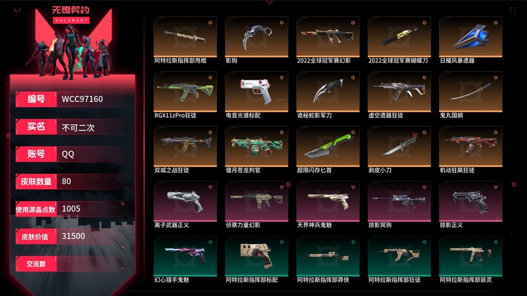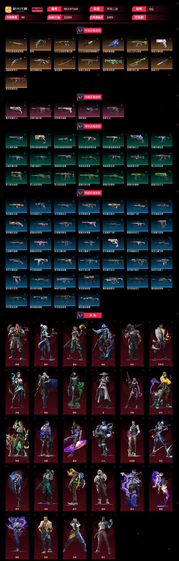 【WCC97160】 | 卓越武器数量:5 | 皮肤资产价值:31500 | 传奇武器数量:15 | 终极武器数量:0 | 日耀风暴奥丁、末日之翼奥丁、纳米打击奥丁 | 幻语魔咒狂怒、逆冲蛮牛狂怒 | 模拟赫兹雄鹿、幻语魔咒雄鹿、逆冲蛮牛雄鹿 | 折光棱晶蜂刺、超限闪存蜂刺 | 浮光跃金战神、太空穿梭战神 | 天界神兵鬼魅、模拟赫兹鬼魅、诡秘蛇影鬼魅、甜蜜战术鬼魅、幻心猎手鬼魅、星云暗涌鬼魅 | 末日之翼飞将、幻语魔咒飞将、悠闲猫生飞将 | 甜蜜战术冥驹、模拟赫兹冥驹、荒土机兵冥驹、掠影冥驹 | 日耀风暴骇灵、阿特拉斯指挥部骇灵、浮光跃金骇灵、荒土机兵骇灵 | 超限闪存莽侠、阿特拉斯指挥部莽侠、诡秘蛇影莽侠 | 虚空遗器狂徒、阿特拉斯指挥部狂徒、诡秘蛇影狂徒、机动狂飙狂徒、RGX11zPro狂徒、荒土机兵狂徒、双城之战狂徒 | 鬼丸国纲、阿特拉斯指挥部甩棍、超限闪存匕首、诡秘蛇影军刀、日耀风暴遗器、影钩、剥皮小刀、2022全球冠军赛蝴蝶刀 | 浮光跃金戍卫、逆冲蛮牛戍卫、太空穿梭戍卫、折光棱晶戍卫、甜蜜战术戍卫 | 禁灭、暮蝶、星礈、蝰蛇、钛狐、海神、K/O、钢锁、猎枭、壹决、霓虹、盖可、夜露、幻棱、幽影、奇乐、不死鸟、黑梦、斯凯、尚勃勒、贤者、雷兹、铁臂、维斯、零、捷风、炼狱、芮娜 | 诡秘蛇影判官、纳米打击判官、太空穿梭判官、甜蜜战术判官、偃月苍龙判官 | 超限闪存正义、日耀风暴正义、掠影正义、太空穿梭正义、离子武器正义 | 2022全球冠军赛幻影、纳米打击幻影、超限闪存幻影、日耀风暴幻影、侦察力量幻影、末日之翼幻影、悠闲猫生幻影 | 末日之翼短炮、悠闲猫生短炮 | 悠闲猫生獠犬、逆冲蛮牛獠犬、模拟赫兹獠犬、幻语魔咒獠犬【买号找回永久包赔】