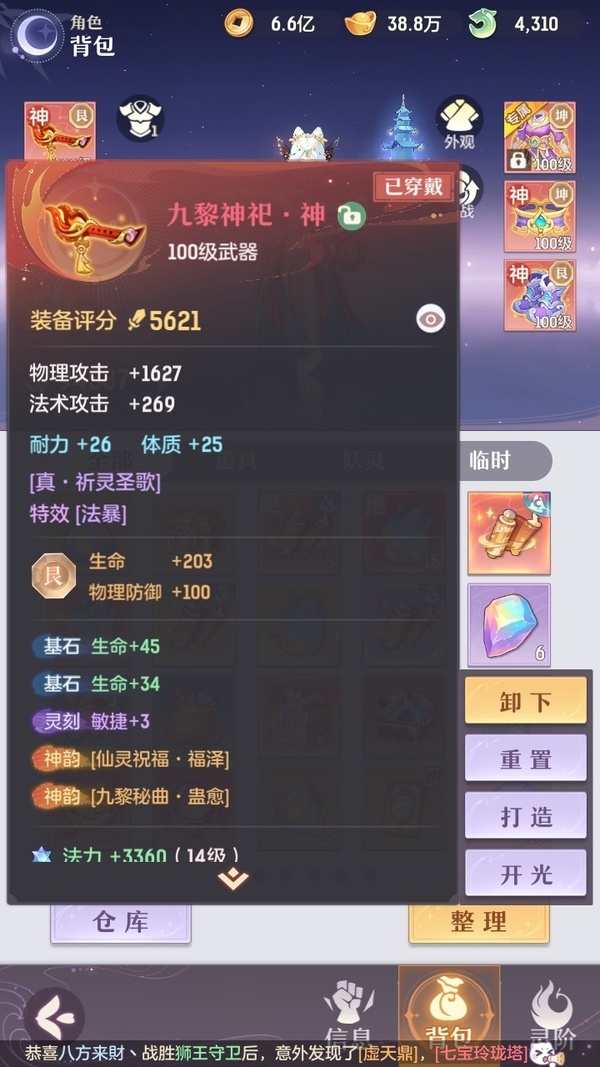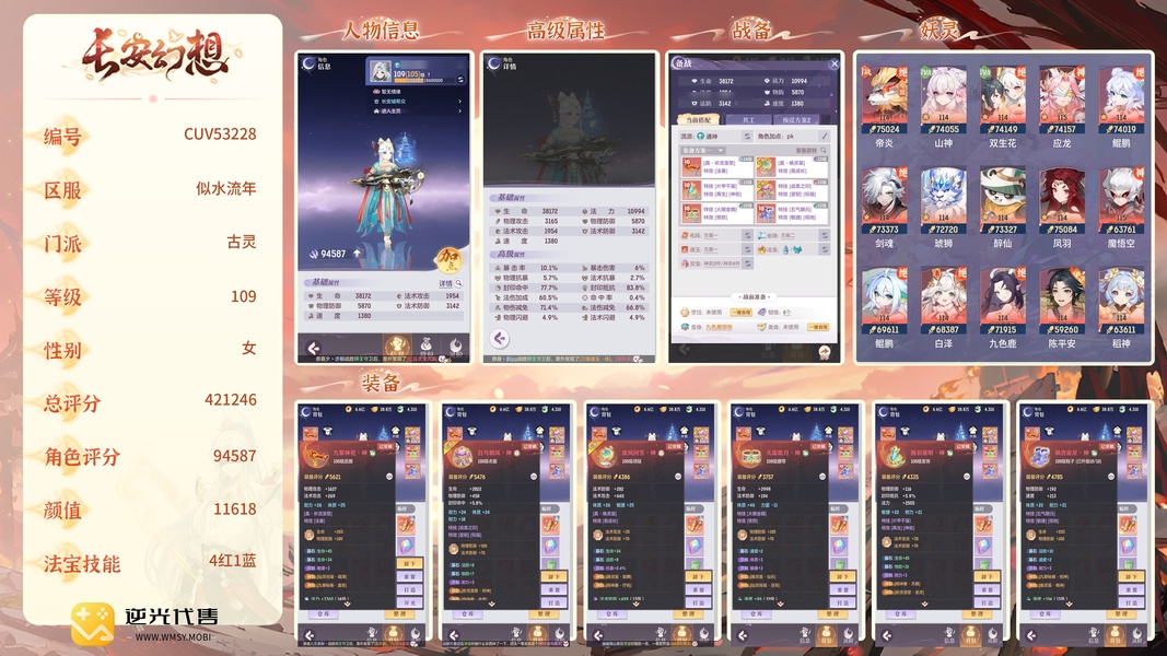 【CUV53228】 | 223228 | 等级:109 | 神兽数:2 | 103431 | 421246 | 角色评分:94587 | 颜值:11618 | 倾天四 | 法宝颜色统计:4红1蓝 | 古灵 | 离火苍龙、九春韶华、淬金曜蚀、乘波踏浪、清寒羽冽、墨染尘烟、星河揽月 | 飞天笔、飞龙在天、红莲·出尘、贯日神君、钱多多、气球派对、万海真君、蕴灵天剑、招财进喵、乘风入梦、狐心入梦、踏火焚夜、凤蝶·梦浮生、跃龙门、神日金乌 | 蝶恋芳菲 | 苍辰、应龙、魔悟空【买号找回永久包赔】