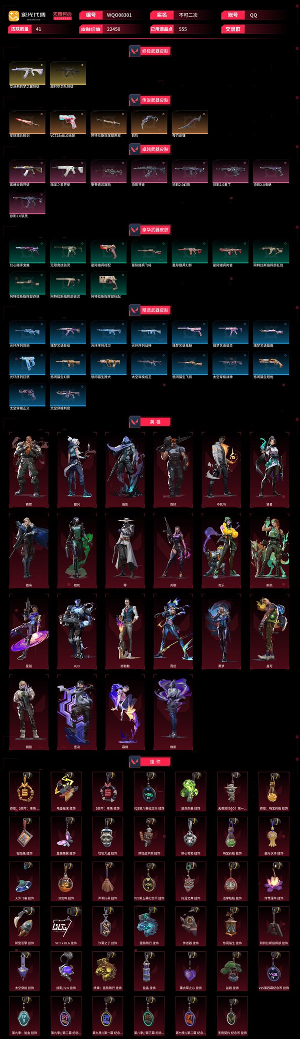 【WQO08301】 | 卓越武器数量:8 | 传奇武器数量:5 | 终极武器数量:2 | 皮肤资产价值:22450 | 超凡大师 | 掠影2.0奥丁 | 光环序列狂怒 | 阿特拉斯指挥部甩棍、夜刃诡镰、星际猎兵短剑、影钩 | 光环序列戍卫、太空穿梭戍卫 | 奇乐、不死鸟、暮蝶、星礈、黑梦、蝰蛇、K/O、斯凯、尚勃勒、钢锁、贤者、壹决、猎枭、铁臂、维斯、霓虹、零、盖可、炼狱、捷风、芮娜、幽影 | 瑰梦艺语雄鹿 | 星际猎兵判官、太空穿梭判官 | 光环序列战神、太空穿梭战神 | 掠影2.0鬼魅、瑰梦艺语鬼魅、幻心猎手鬼魅 | 悠闲猫生飞将、星际猎兵飞将 | 太空穿梭正义 | 堕天遗武冥驹、光环序列冥驹 | 星际猎兵幻影、悠闲猫生幻影、掠影2.0幻影 | 悠闲猫生短炮 | 悠闲猫生獠犬 | 无限竞技骇灵、瑰梦艺语骇灵、阿特拉斯指挥部骇灵、掠影2.0骇灵 | 阿特拉斯指挥部莽侠 | 阿特拉斯指挥部狂徒、紫阙金琅狂徒、海洋之星狂徒、瑰梦艺语狂徒、超时空卫队狂徒、艾沃莉的梦之翼狂徒、掠影狂徒【买号找回永久包赔】