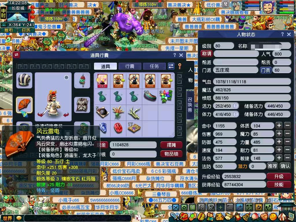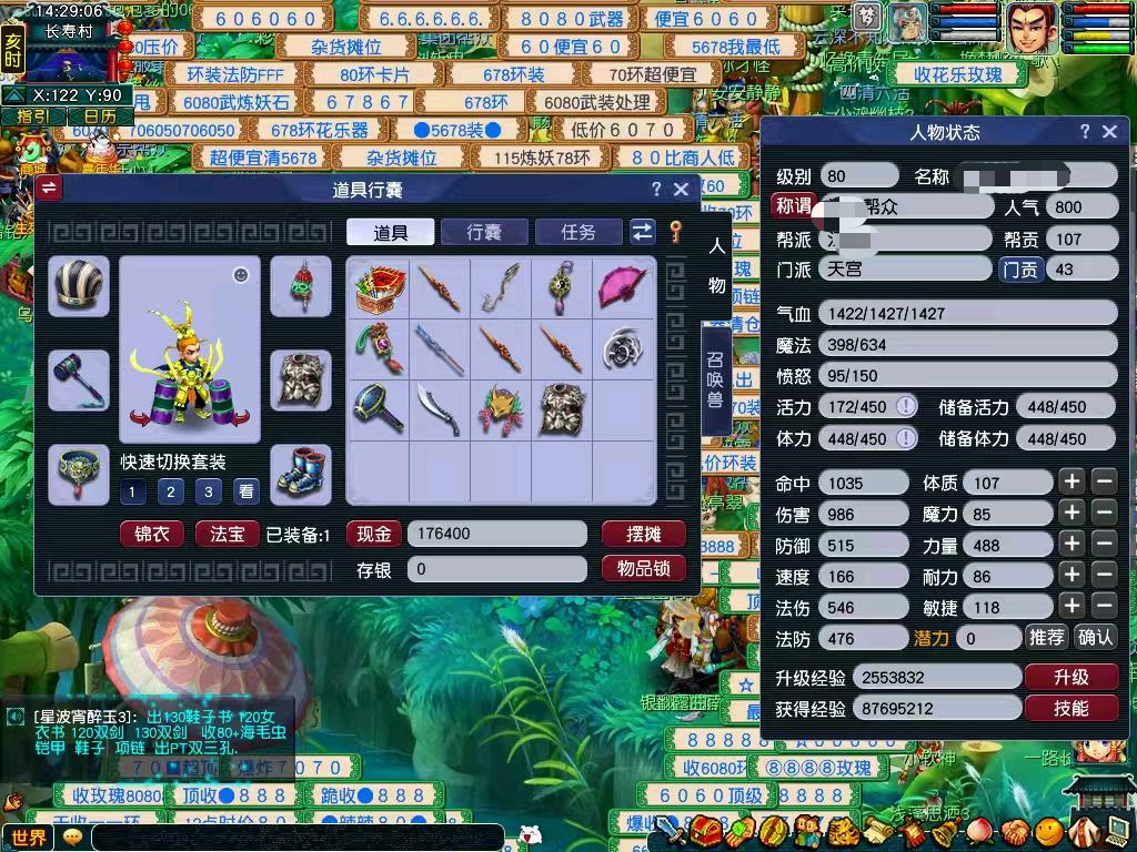 1五庄(有天阵)1天宫,3普陀。5开带小极品装备,有86级攻宝宝天兵,86级法瑞兽,82级血敏凤凰。拿到号就可以北俱封妖,抓鬼,场景。