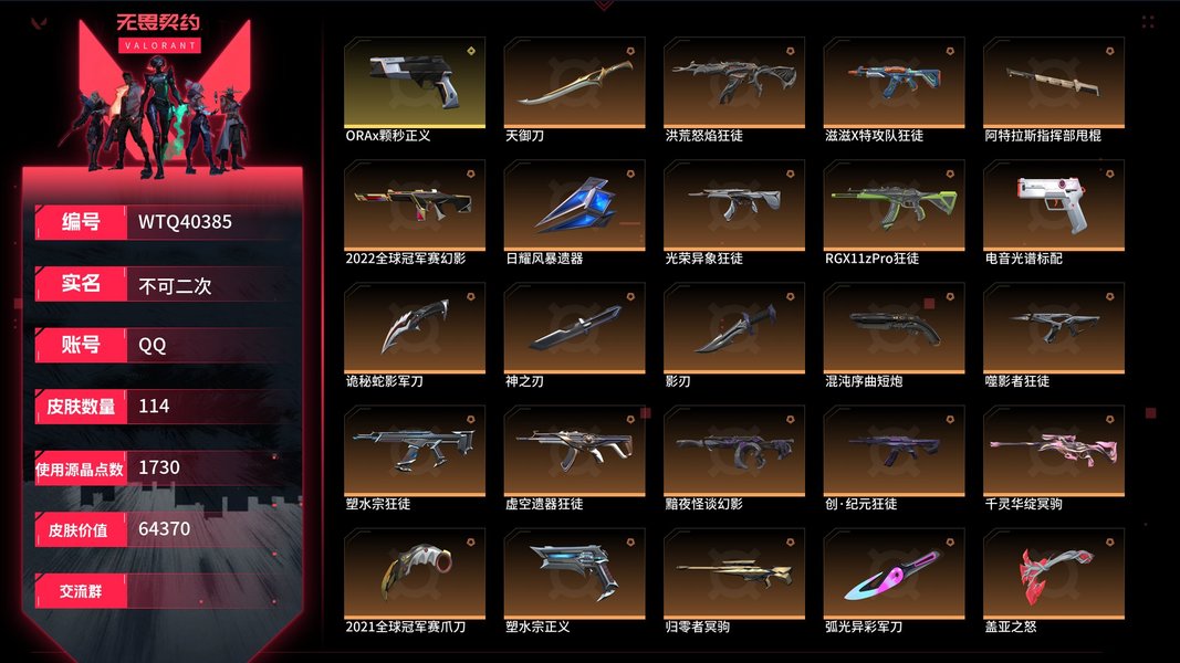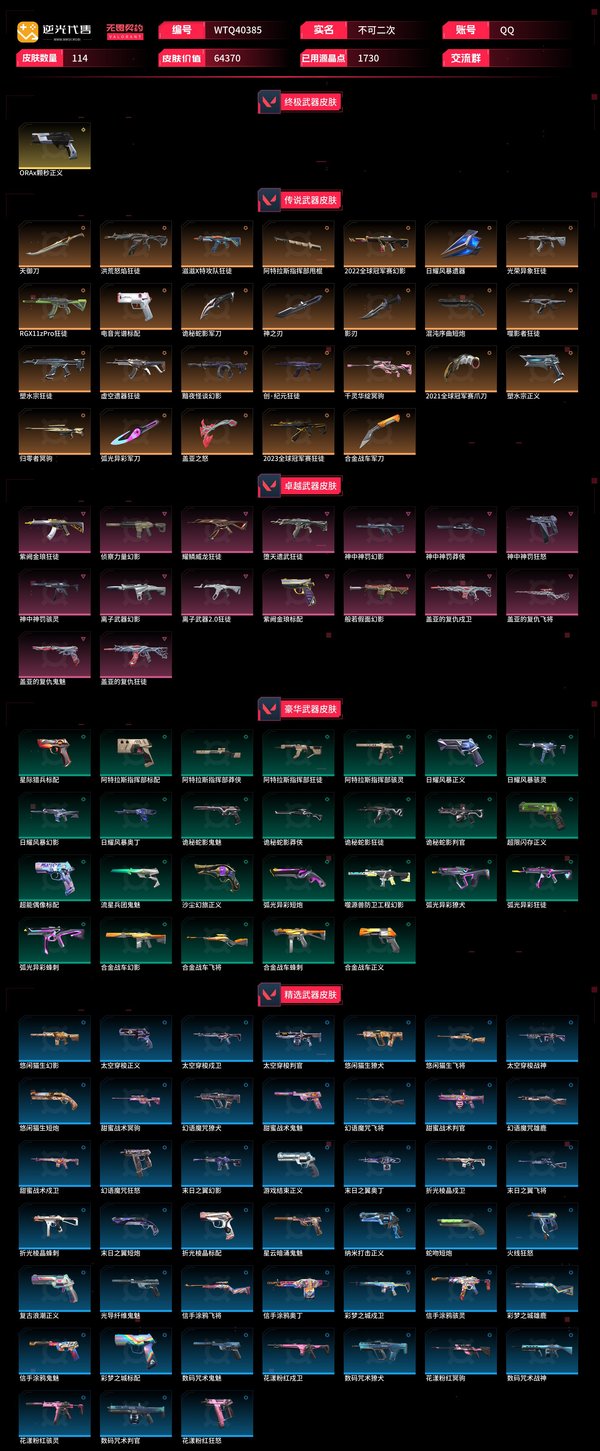 【WTQ40385】 | 卓越武器数量:16 | 皮肤资产价值:64370 | 传奇武器数量:26 | 终极武器数量:1 | 超凡大师 | 日耀风暴奥丁、信手涂鸦奥丁、末日之翼奥丁 | 火线狂怒、幻语魔咒狂怒、花漾粉红狂怒、神中神罚狂怒 | 幻语魔咒雄鹿、彩梦之城雄鹿 | 合金战车蜂刺、折光棱晶蜂刺、弧光异彩蜂刺 | 数码咒术战神、太空穿梭战神 | 诡秘蛇影鬼魅、甜蜜战术鬼魅、数码咒术鬼魅、星云暗涌鬼魅、光导纤维鬼魅、盖亚的复仇鬼魅、流星兵团鬼魅、信手涂鸦鬼魅 | 末日之翼飞将、信手涂鸦飞将、幻语魔咒飞将、悠闲猫生飞将、盖亚的复仇飞将、合金战车飞将 | 归零者冥驹、甜蜜战术冥驹、千灵华绽冥驹、花漾粉红冥驹 | 神中神罚骇灵、信手涂鸦骇灵、日耀风暴骇灵、花漾粉红骇灵、阿特拉斯指挥部骇灵 | 神中神罚莽侠、阿特拉斯指挥部莽侠、诡秘蛇影莽侠 | 洪荒怒焰狂徒、紫阙金琅狂徒、离子武器2.0狂徒、光荣异象狂徒、堕天遗武狂徒、RGX11zPro狂徒、耀鳞威龙狂徒、弧光异彩狂徒、盖亚的复仇狂徒、虚空遗器狂徒、阿特拉斯指挥部狂徒、诡秘蛇影狂徒、噬影者狂徒、2023全球冠军赛狂徒、滋滋X特攻队狂徒、塑水宗狂徒、创·纪元狂徒 | 阿特拉斯指挥部甩棍、天御刀、诡秘蛇影军刀、2021全球冠军赛爪刀、日耀风暴遗器、神之刃、影刃、弧光异彩军刀、合金战车军刀、盖亚之怒 | 盖亚的复仇戍卫、彩梦之城戍卫、太空穿梭戍卫、折光棱晶戍卫、甜蜜战术戍卫、花漾粉红戍卫 | 禁灭、暮蝶、星礈、钛狐、蝰蛇、K/O、海神、钢锁、壹决、猎枭、霓虹、盖可、夜露、幻棱、幽影、奇乐、不死鸟、黑梦、斯凯、尚勃勒、贤者、雷兹、铁臂、维斯、零、炼狱、捷风、芮娜 | 诡秘蛇影判官、数码咒术判官、太空穿梭判官、甜蜜战术判官 | 沙尘幻旅正义、塑水宗正义、纳米打击正义、超限闪存正义、合金战车正义、日耀风暴正义、游戏结束正义、复古浪潮正义、太空穿梭正义、ORAx颗秒正义 | 2022全球冠军赛幻影、神中神罚幻影、合金战车幻影、噬源兽防卫工程幻影、日耀风暴幻影、般若假面幻影、侦察力量幻影、离子武器幻影、末日之翼幻影、悠闲猫生幻影、黯夜怪谈幻影 | 末日之翼短炮、弧光异彩短炮、悠闲猫生短炮、蛇吻短炮、混沌序曲短炮 | 数码咒术獠犬、悠闲猫生獠犬、幻语魔咒獠犬、弧光异彩獠犬【买号找回永久包赔】
