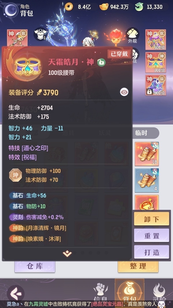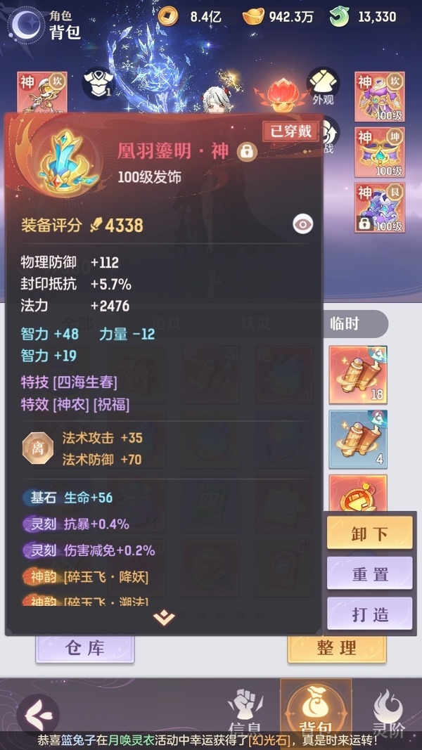 【CCP29290】 | 颜值:17821 | 等级:109 | 龙宫 | 神兽数:3 | 法宝颜色统计:10红0蓝 | 总评分:421383 | 角色评分:97630 | 妖灵评分:220942 | 灵师评分:102811 | 倾天三 | 离火苍龙,九春韶华,淬金曜蚀,织梦星海,火树银花,乘波踏浪,山君现,清寒羽冽,碎梦语情,灵鸢一梦,一刹雷鸣,墨染尘烟,星河揽月 | 蝶恋芳菲 | 乌蹄·照夜,太一驴,吾皇·萌骑,蟹有钳,钱多多,气球派对,灵华引,星昀渡,比翼同舆,万海真君,罗帷七香车,蕴灵天剑,负山海,北域霜枭,跃龙门,鸭与云游,飞龙在天,兔球,大荒之主,海月璃梦,贯日神君,焚天火凤,花将军,招财进喵,初弦瑶桂,乘风入梦,风驰电掣,踏火焚夜,凤蝶·梦浮生 | 【买号找回永久包赔】