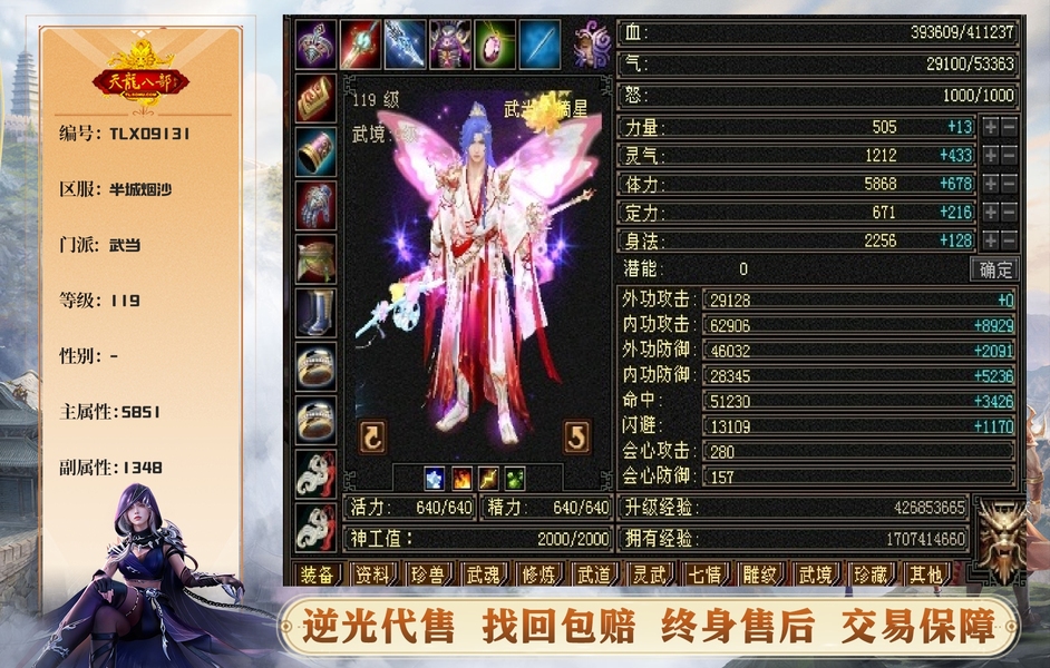 低价出41万血摘星武当,高内攻,高命中。十多个6级宝石。4神6荒兽魂。
