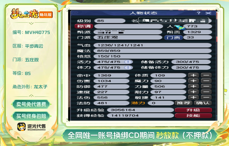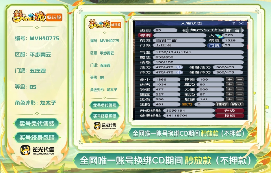 【MVH40775】 | 等级:85 | 五庄观,普陀山 | 无换绑CD | 30天尊享特权 | 【逆光代售卖号0手续费】【买号找回永久包赔】