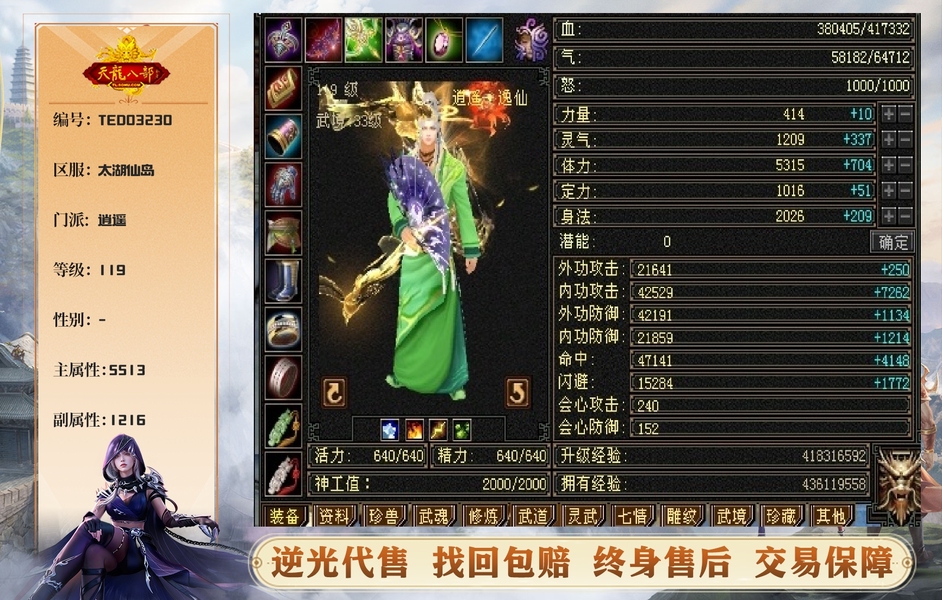 跟朋友换区了,五级高性价比逍遥,金箭匣、紫仙侣,带五个双十宝宝及所有。跟朋友刷副本伤害基本前二,倍有面子