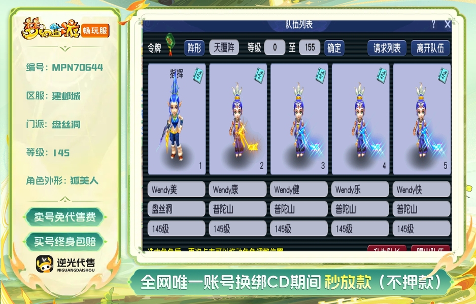 145级天阵1盘丝4普陀!身上4e经验可秒升150!三组宝宝一组芙蓉ps组合专用的防中毒抗封!一组法如意一组耐卡雨师!普陀全部6丹!装备全部130和140属性装!太虚挂机杀!神器1到2星没压力!每天卖符也有几百万!帮贡够点到20修!逆光买的刷了几天每天200块很轻松!没时间玩后期配合一切藏宝阁手续!不压款过年用钱!