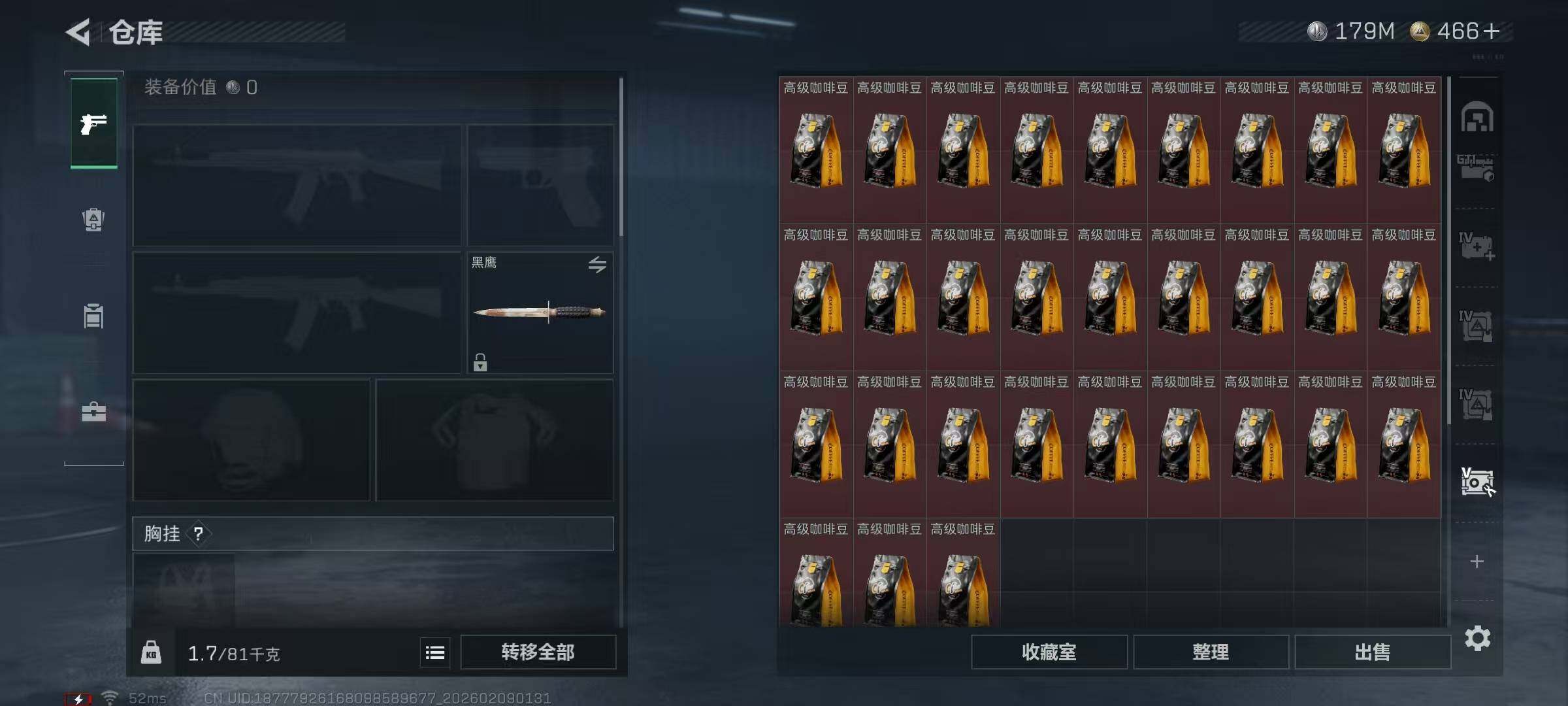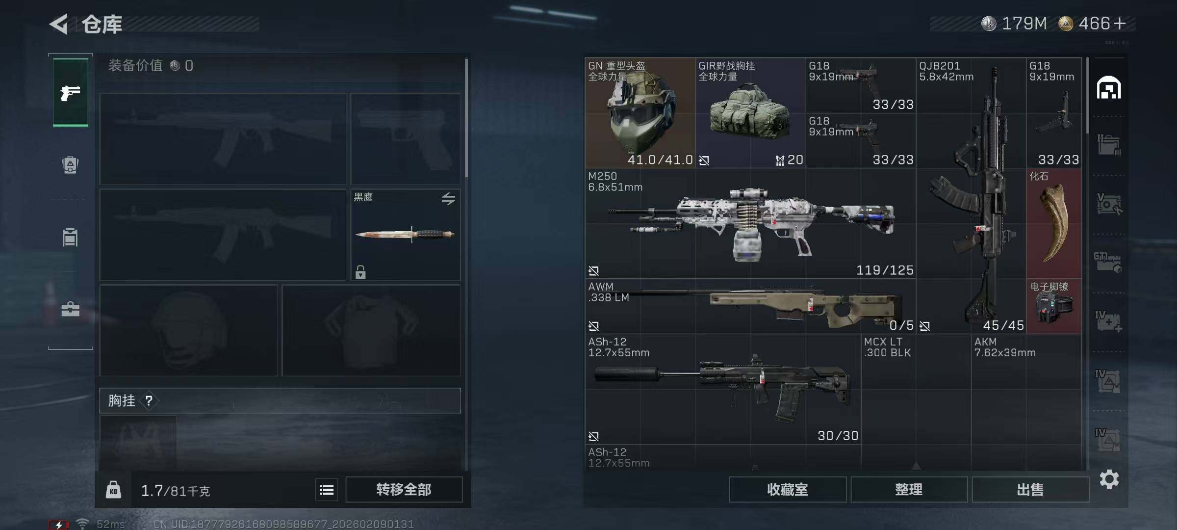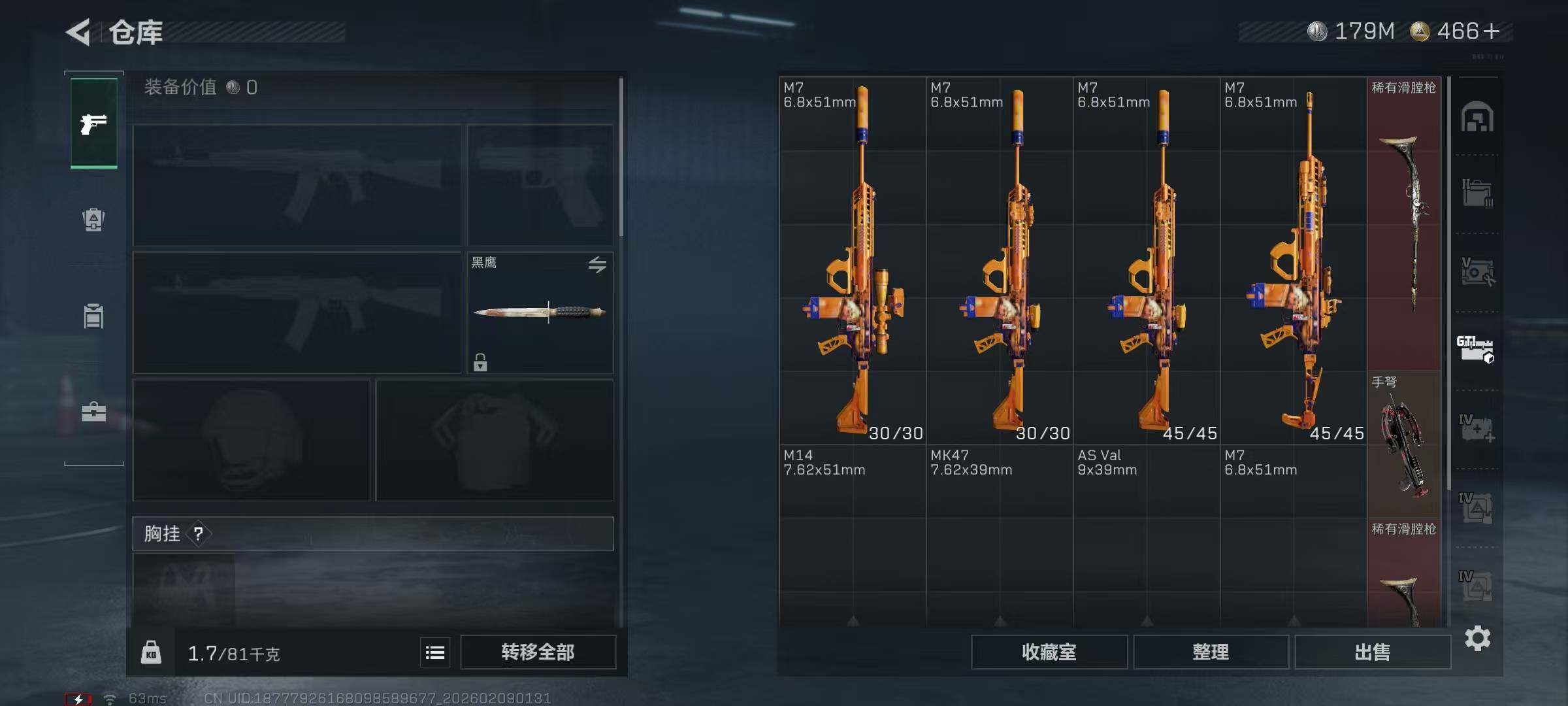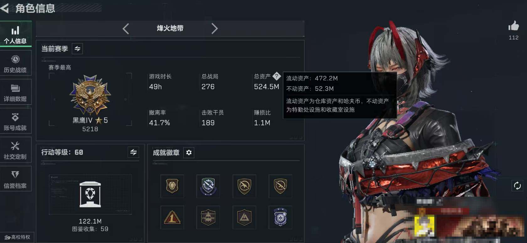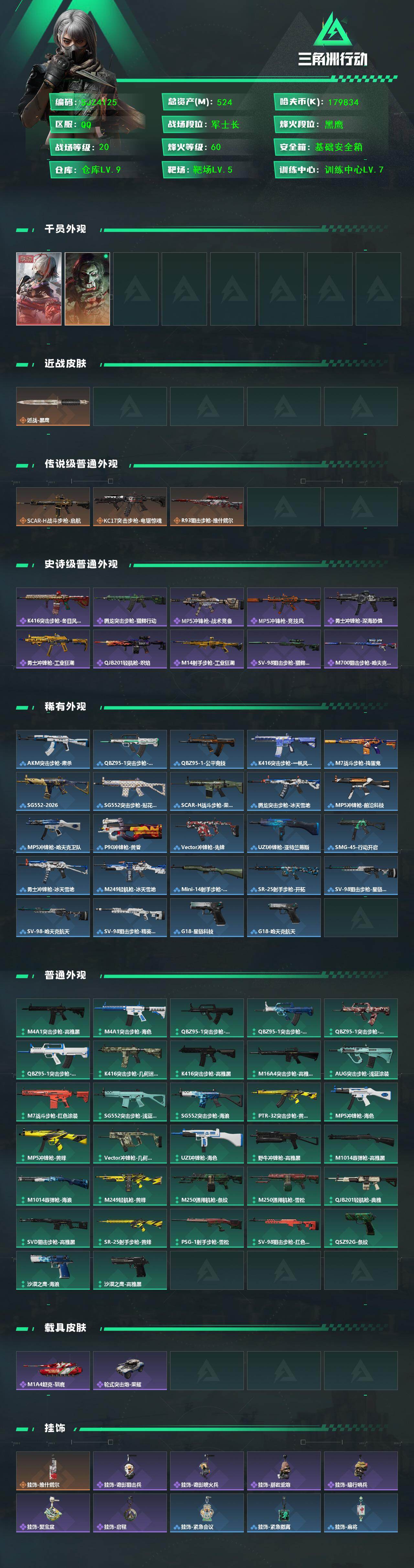 【SCG02059】 | 战场等级:20 | 行动等级:60 | 通行证等级:1 | 总资产:524M | 现有哈夫币:179834W | 黑鹰 | KC17突击步枪-电锯惊魂,勇士冲锋枪-深海恐惧,SV-98狙击步枪-猎鳄行动,SCAR-H战斗步枪-启航,R93狙击步枪-维什戴尔,勇士冲锋枪-工业狂潮,MP5冲锋枪-战术竞备 | M1A4坦克-驯鹿,轮式突击炮-荣耀 | 挂饰:挂饰-诡影喷火兵,挂饰-启程,挂饰-诡影狙击兵,挂饰-维什戴尔,挂饰-紧急会议