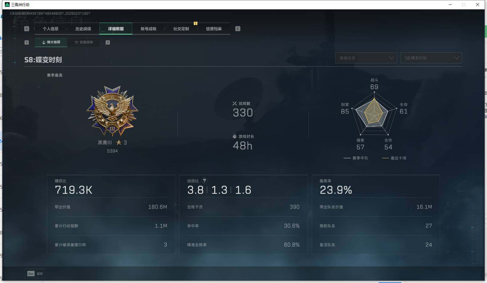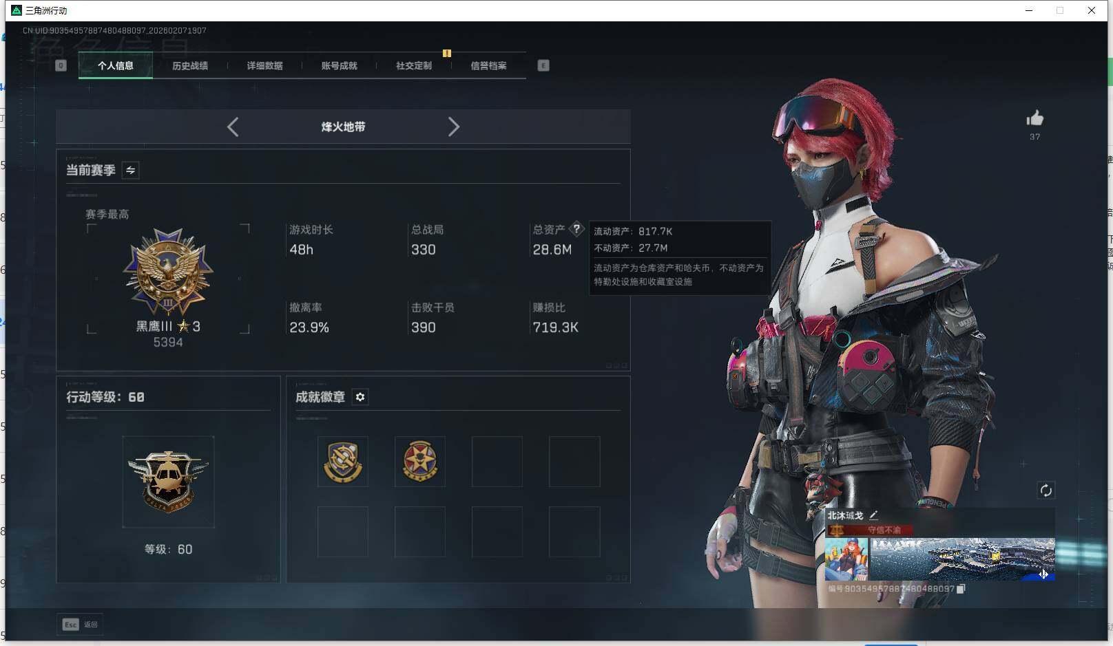 【SBG87907】 | 战场等级:9 | 行动等级:60 | 通行证等级:1 | 总资产:28M | 现有哈夫币:45W | 黑鹰,怜悯 | QBZ95-1突击步枪-曙光,SCAR-H战斗步枪-启航,AWM狙击步枪-流沙送葬,SG552突击步枪-深海恐惧,SVD狙击步枪-暗夜猎手,AKM突击步枪-林中猎手,Vector冲锋枪-百步穿杨,SVD狙击步枪-阿萨拉工艺,SG552突击步枪-运动员,KC17突击步枪-碎冰行动,MP5冲锋枪-深海恐惧,G3战斗步枪-流沙送葬,SR-25射手步枪-尖端治疗,M16A4突击步枪-竞赛选手,M700狙击步枪-守夜人,MP7冲锋枪-原型机,Vector冲锋枪-能天使-午夜邮差,勇士冲锋枪-能天使-午夜邮差,PTR-32突击步枪-英雄,SV-98狙击步枪-囚徒,M700狙击步枪-竞技风,Vector冲锋枪-猎鳄行动,AUG突击步枪-蝮蛇,Vector冲锋枪-阿萨拉文明,M1014霰弹枪-林中猎手,SG552突击步枪-尖端治疗,M700狙击步枪-百步穿杨,M7战斗步枪-百步穿杨,AK-12突击步枪-夜鹰 | 轮式突击炮-荣耀 | 能天使·午夜邮差 | 挂饰:挂饰-黑,挂饰-小羊,挂饰-启程,挂饰-维什戴尔,挂饰-能天使,挂饰-彩蛋