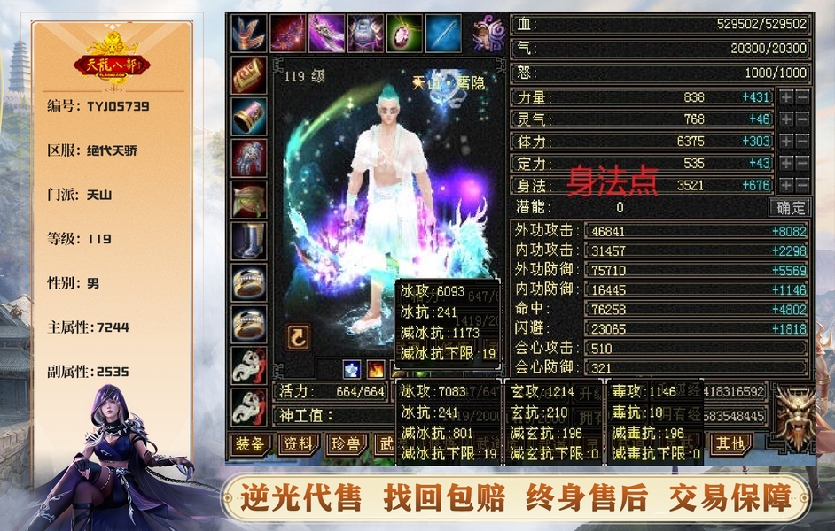 【TYJ05739】 | 天山 | 等级:119 | 主属性:7244 | 副属性:2535 | 男 | 主冰攻 | VIP6 | 畅游账号