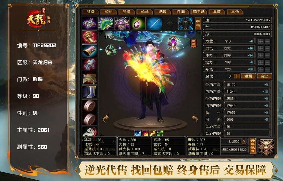 【TIF29202】 | 逍遥 | 等级:98 | 主属性:2861 | 副属性:560 | 男 | 主火攻