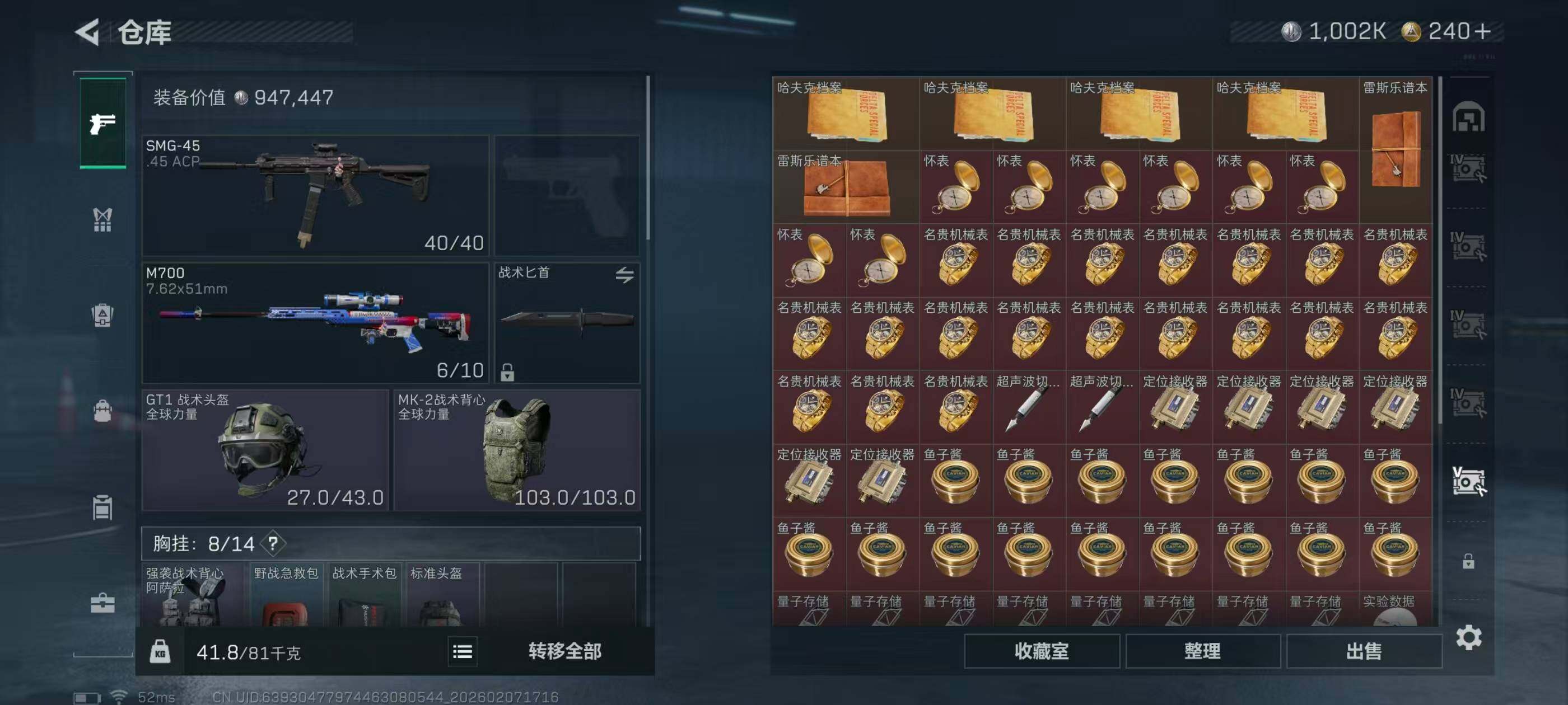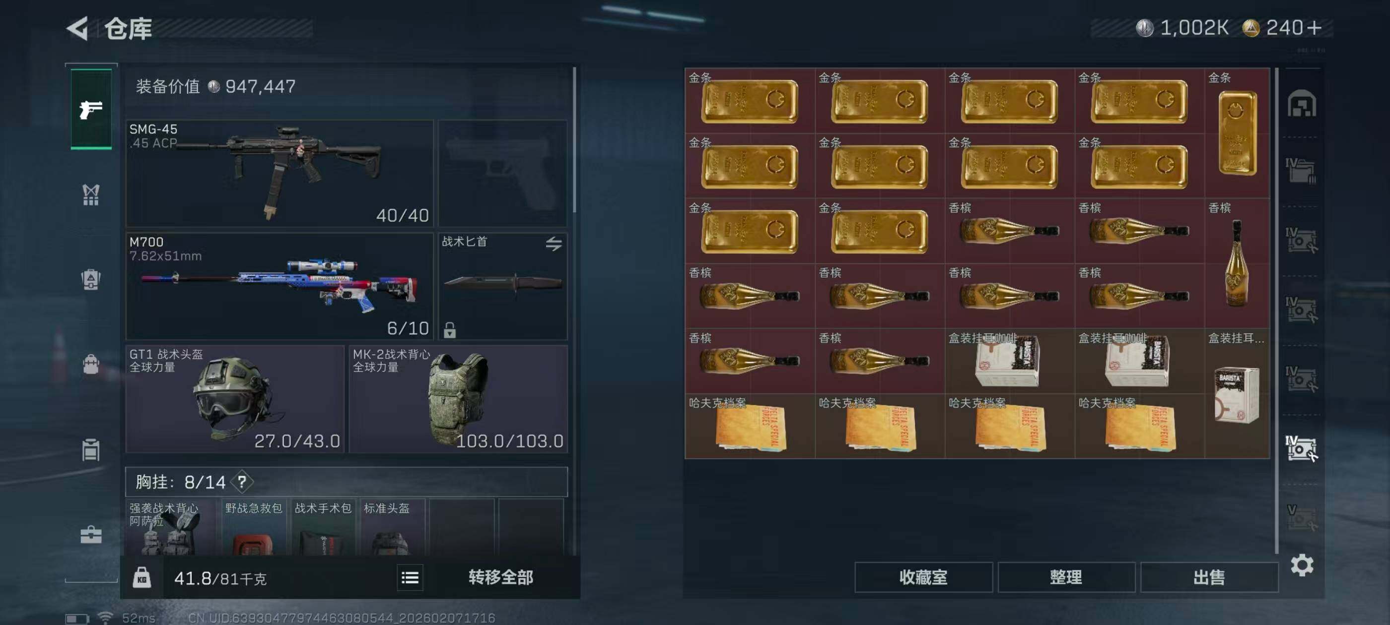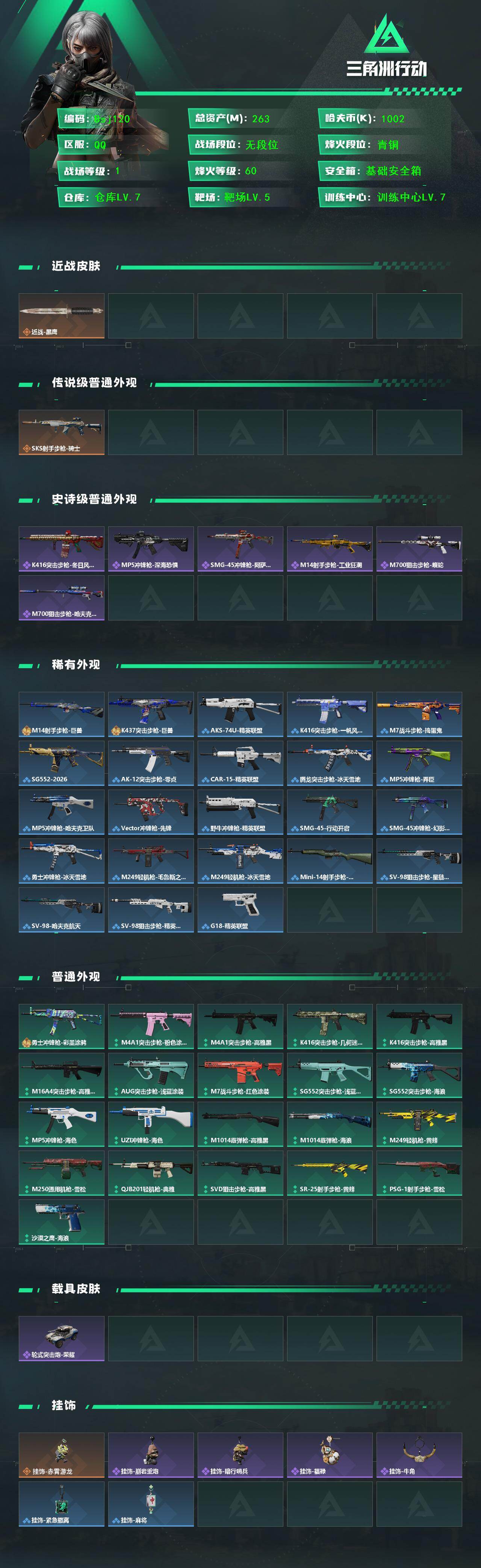 【SEV78566】 | 战场等级:1 | 行动等级:60 | 通行证等级:1 | 总资产:263M | 现有哈夫币:1002W | 黑鹰 | M700狙击步枪-蝮蛇,MP5冲锋枪-深海恐惧 | 轮式突击炮-荣耀 | 挂饰