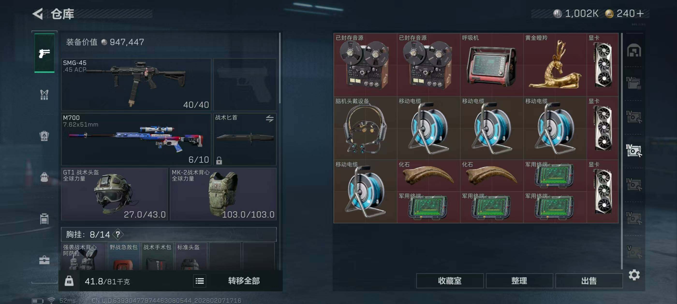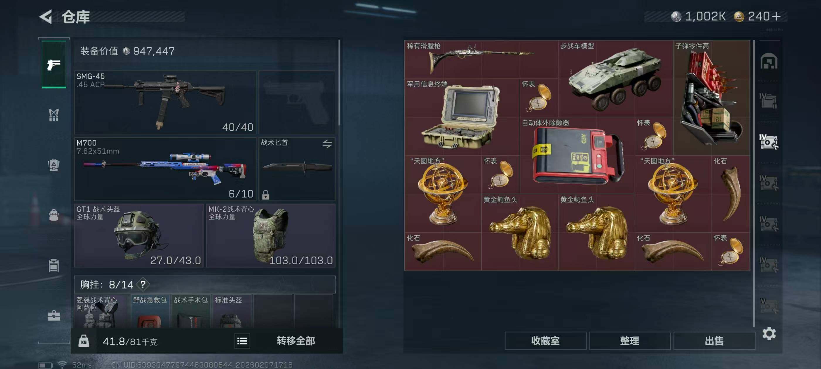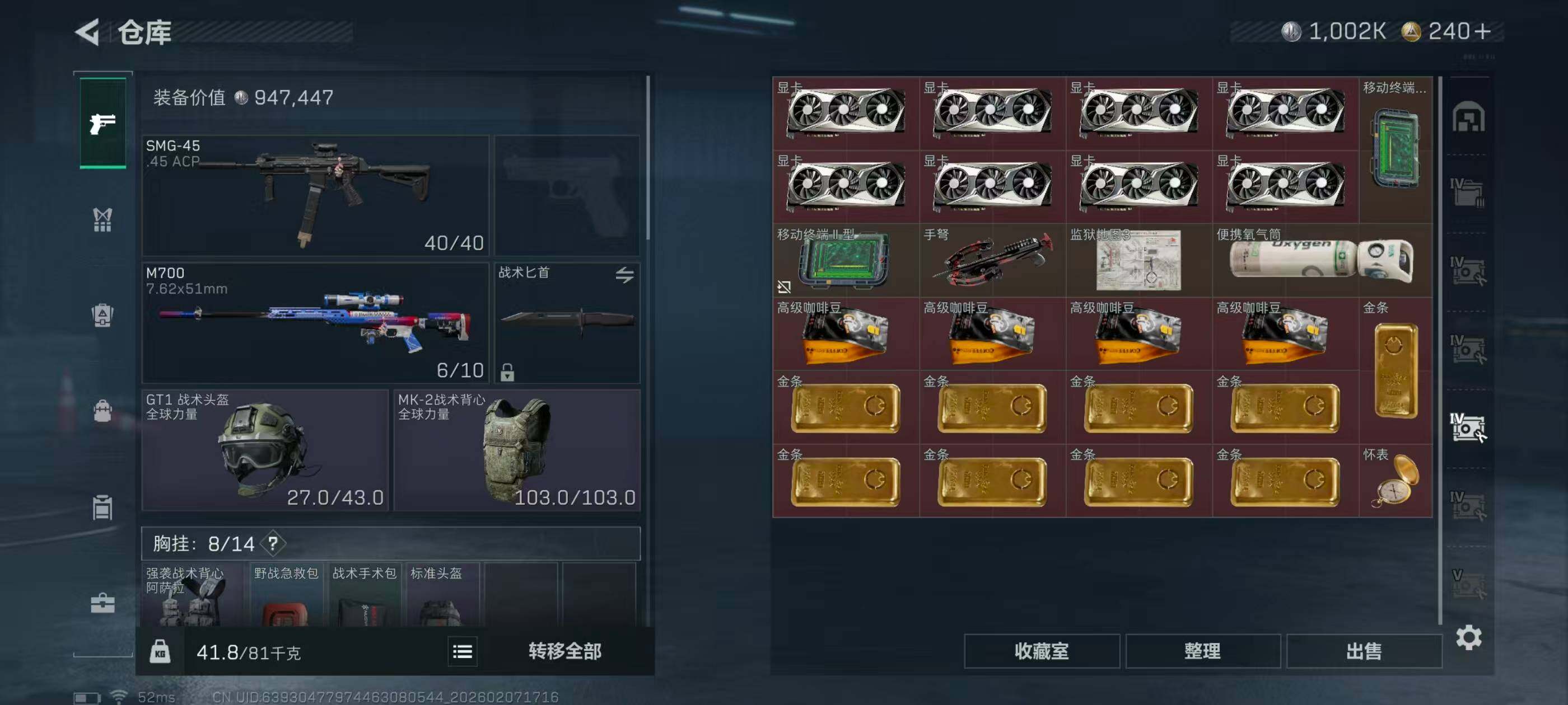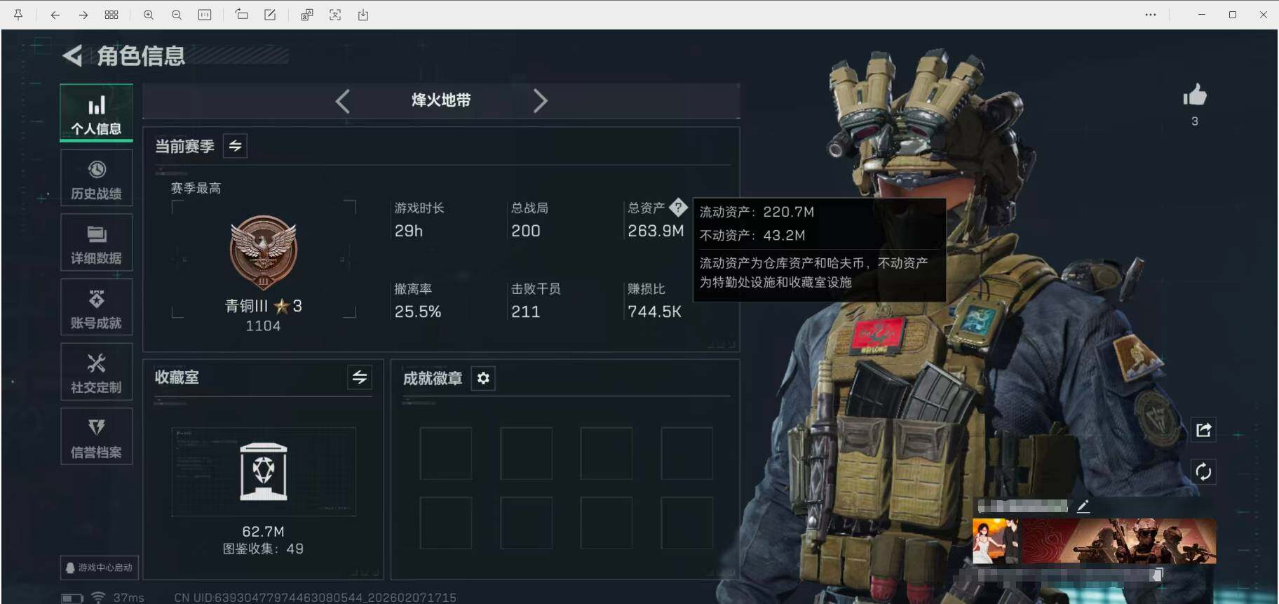 【SEV78566】 | 战场等级:1 | 行动等级:60 | 通行证等级:1 | 总资产:263M | 现有哈夫币:1002W | 黑鹰 | M700狙击步枪-蝮蛇,MP5冲锋枪-深海恐惧 | 轮式突击炮-荣耀 | 挂饰