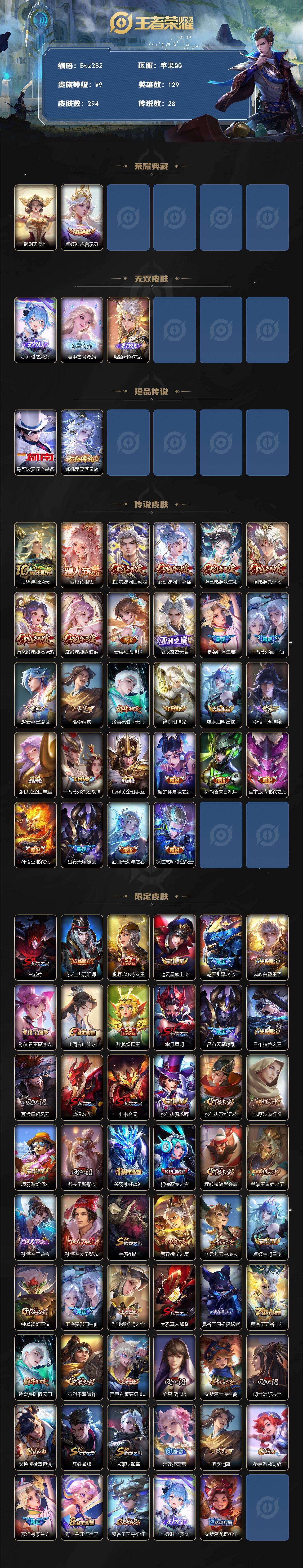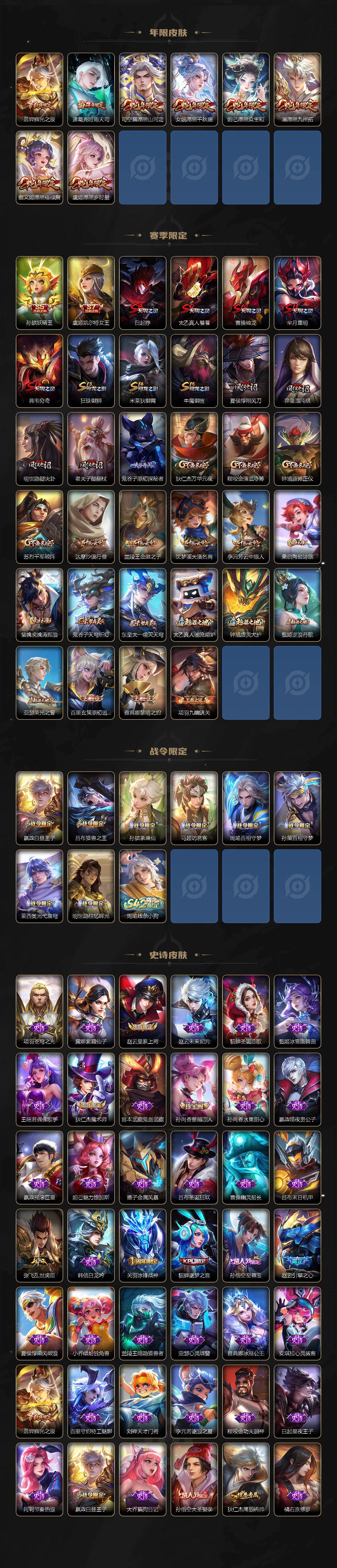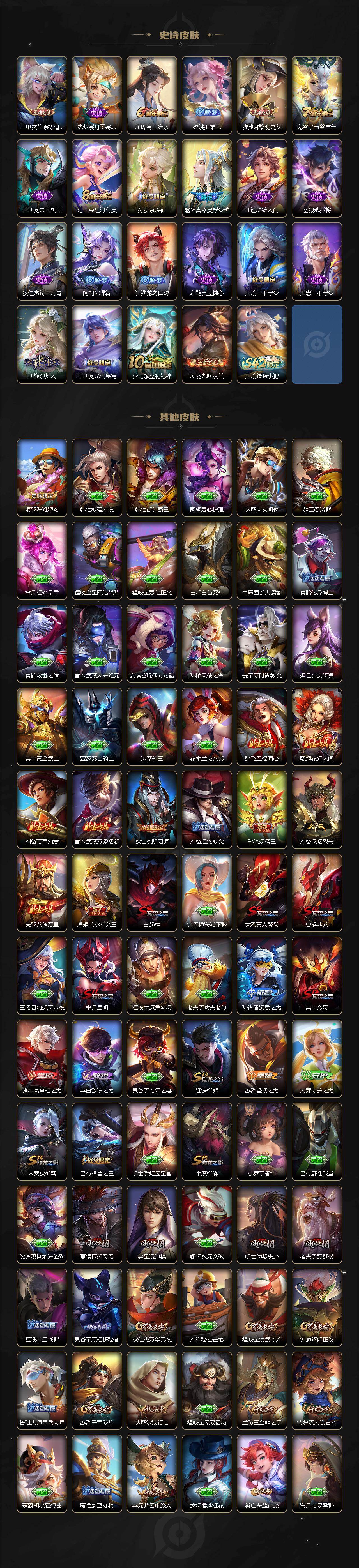 【WQI61169】 | 英雄数量:129 | 皮肤数量:294 | 未用荣耀水晶数量:0 | 武则天 | 武则天 | 马可波罗怪盗基德,嫦娥器灵·落星盏 | 小乔时之魔女,曜器灵·螭龙剑,甄姬雪境奇遇 | 虞姬神鉴启示录 | 鬼谷子天穹祈灯,孙悟空大圣娶亲,夏侯惇朔风刀,少司缘巫礼祀神,沈梦溪大漠名商,狂铁御狮,后羿辉光之辰,女娲愿照·千秋盛,孙膑茶境仙,百里玄策原初追逐者,芈月重明,甄姬雪境奇遇,孙尚香蔷薇恋人,明世隐往忆晖光,裴擒虎擒涛扼浪,鬼谷子原初探秘者,狄仁杰魔术师,莱西奥光弋星穹,嫦娥拒霜思,鬼谷子克喵,赵云皇家上将,后羿神树通天,艾琳鹤鸣心笺,夏洛特浮生妄,孙悟空至尊宝,吕布猎兽之王,沈梦溪龙舞盛年,米莱狄御霄,项羽海滩派对,牛魔御旌,嬴政白昼王子,苏烈千军破阵,马超访茗客,曜李逍遥,曹操逐霄之志,关羽冰锋战神,虞姬凯尔特女王,赵怀真器灵·浮梦炉,弈星混沌棋,西施织梦人,诸葛亮时雨天司,曹操烛龙,西施续相思,太乙真人饕餮,虞姬启明星使,老夫子醍醐杖,钟馗驱傩正仪,虞姬愿照·岁时盈,孙膑妖精王,妲己愿照·众生和,典韦穷奇,桑启海盐诗旅,达摩沙漠行僧,亚瑟荣光之誓,小乔时之魔女,庄周高山流水,白起狰,明世隐疑决卦,雅典娜黎明之约,李元芳云中旅人,貂蝉逐梦之音,程咬金演武夺筹,阿古朵江河有灵,鬼谷子五谷丰年,干将莫邪画中仙,狄仁杰万华元夜,吕布天魔缭乱,周瑜线条小狗,赵云引擎之心,狄仁杰阴阳师,司空震愿照·山河定,澜愿照·九州拓,兰陵王金庭之子 | 吕布猎兽之王,周瑜百相守梦,莱西奥光弋星穹,马超访茗客,孙策百相守梦,孙膑茶境仙,嬴政白昼王子,明世隐往忆晖光 | 鬼谷子天穹祈灯,夏侯惇朔风刀,沈梦溪大漠名商,曹操烛龙,狂铁御狮,太乙真人饕餮,老夫子醍醐杖,百里玄策原初追逐者,芈月重明,钟馗驱傩正仪,孙膑妖精王,典韦穷奇,裴擒虎擒涛扼浪,鬼谷子原初探秘者,甄姬逆浪荇歌,桑启海盐诗旅,达摩沙漠行僧,亚瑟荣光之誓,东皇太一噬灭天穹,白起狰,明世隐疑决卦,雅典娜黎明之约,李元芳云中旅人,程咬金演武夺筹,太乙真人谧流熔炉,米莱狄御霄,狄仁杰万华元夜,牛魔御旌,苏烈千军破阵,虞姬凯尔特女王,兰陵王金庭之子 | 孙悟空大圣娶亲,亚瑟心灵战警,宫本武藏鬼剑武藏,雅典娜冰冠公主,亚连糖绘人间,后羿辉光之辰,百里玄策原初追逐者,项羽九幽镇关,王昭君偶像歌手,孙尚香蔷薇恋人,张飞乱世虎臣,狄仁杰鹰眼统帅,狄仁杰魔术师,嫦娥拒霜思,赵云皇家上将,韩信白龙吟,刘禅天才门将,孙悟空至尊宝,曹操幽灵船长,墨子金属风暴,黄忠百相守梦,嬴政白昼王子,貂蝉圣诞恋歌,阿轲化蝶舞,白起星夜王子,扁鹊灵蛊蚀心,橘右京修罗,狄仁杰绮世丹青,妲己魅力维加斯,关羽冰锋战神,嬴政暗夜贵公子,大乔猫狗日记,小乔缤纷独角兽,赵云未来纪元,吕布末日机甲,百里守约特工魅影,夏侯惇乘风破浪,嬴政摇滚巨星,沈梦溪月团寄思,庄周高山流水,兰陵王暗隐猎兽者,露娜紫霞仙子,莱西奥末日机甲,李元芳逐浪之夏,雅典娜黎明之约,安琪拉心灵骇客,程咬金功夫厨神,貂蝉逐梦之音,吕布圣诞狂欢,阿古朵江河有灵,鬼谷子五谷丰年,孙尚香水果甜心,赵云引擎之心,狂铁龙之律动,苍狼魂孤将,项羽苍穹之光,阿轲节奏热浪,甄姬冰雪圆舞曲 | 诸葛亮时雨天司,孙悟空地狱火,西施续相思,宫本武藏地狱之眼,虞姬启明星使,女娲愿照·千秋盛,虞姬愿照·岁时盈,妲己愿照·众生和,云缨幻光神枪,孙尚香末日机甲,狄仁杰超时空战士,貂蝉仲夏夜之梦,镜炽阳神光,夏洛特浮生妄,干将莫邪久胜战神,后羿黄金射手座,干将莫邪画中仙,赵云淬星耀世,蔡文姬愿照·福禄聚,吕布天魔缭乱,嬴政玄雷天君,张良黄金白羊座,李信一念神魔,嫦娥器灵·落星盏,司空震愿照·山河定,澜愿照·九州拓,曜李逍遥,武则天海洋之心 | 孙尚香蔷薇恋人 | 公孙离花间舞,张飞五福同心,后羿完美运算,沈梦溪棒球奇才,甄姬花好人间,伽罗花见巫女,杨戬埃及法老,程咬金无双福将,孙膑未来旅行,小乔万圣前夜,司空震启蛰,诸葛亮掌控之力,米莱狄精准探案法,梦奇美梦成真,李信灼热之刃,露娜命运加冕,沈梦溪龙舞盛年,孙尚香沉稳之力,司马懿魇语军师,明世隐占星师,东皇太一金福满堂,宫本武藏未来纪元,鲁班七号福禄兄弟,亚连破局者,孙权径山谋武,刘备浪漫序章,老夫子功夫老勺,刘备万事如意,暃碧珀绯影,孙膑天使之翼,典韦黄金武士,马超幸存者,瑶森,鲁班七号木偶奇遇记,哪吒三太子,马可波罗激情绿茵,高渐离金属狂潮,蒙恬蔚蓝守将,宫本武藏万象初新,程咬金星际陆战队,关羽龙腾万里,刘禅英喵野望,裴擒虎街头旋风,花木兰兔女郎,盘古创世神祝,姬小满小满鸭,项羽帝国元帅,诸葛亮星航指挥官,钟无艳生化警戒,白起白色死神,金蝉前尘,姜子牙时尚教父,程咬金爱与正义,夏侯惇战争骑士,达摩爆裂喵拳,姬小满零食大作战,老夫子潮流仙人,钟馗虚灵犬护,牛魔西部大镖客,狂铁命运角斗场,云中君云械蓝图,刘禅秘密基地,貂蝉异域舞娘,狄仁杰锦衣卫,桑启画中游,廉颇功夫炙烤,上官婉儿修竹墨客,关羽天启骑士,刘备汉昭烈帝,曹操死神来了,高渐离落日弦歌,澜孤猎,露娜绯红之刃,哪吒罗小黑战记,猪八戒潮玩探月行,镜冰刃幻境,赵云忍炎影,影魅影绮裳,蒙犽胡桃狂想曲,鬼谷子幻乐之宴,达摩拳王,曜归虚梦演,妲己少女阿狸,嫦娥露花倒影,云缨赤焰之缨,安琪拉玩偶对对碰,狂铁特工战影,阿古朵熊喵少女,后羿精灵王,弈星踏