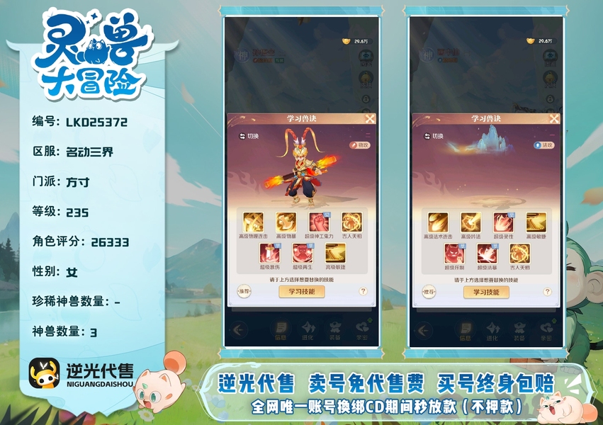 【LKD25372】 | 仙器:6 | 神兽数量:3 | 角色评分:26333 | 珍兽数量:3 | 等级:235 | 方寸 | 女 | 精卫,画中仙,孙悟空 | 貔貅,龙马