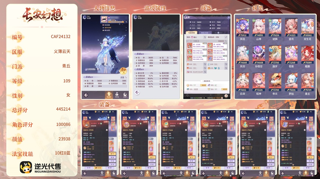 【CAF24132】 | 颜值:23938 | 等级:109 | 青丘 | 神兽数:4 | 法宝颜色统计:10红0蓝 | 总评分:445214 | 角色评分:100086 | 妖灵评分:225993 | 灵师评分:119135 | 倾天三 | 淬金曜蚀,织梦星海,乘波踏浪,山君现,清寒羽冽,灵鸢一梦,墨染尘烟,星河揽月,离火苍龙,九春韶华,玉兔月赏,火树银花,哈?我当武器?,碎梦语情,炙烤大串,一刹雷鸣 | 蝶恋芳菲 | 乌蹄·照夜,祥云,嘟嘟雪橇,吾皇·萌骑,蟹有钳,钱多多,气球派对,灵华引,比翼同舆,万海真君,罗帷七香车,浪起来,飞起来·壹号,负山海,跃龙门,神日金乌,鸭与云游,飞天笔,飞龙在天,红莲·出尘,兔球,大荒之主,海月璃梦,贯日神君,玄夜星羚,通明心剑,焚天火凤,花将军,招财进喵,初弦瑶桂,乘风入梦,鼠鼠·星愿巫,狐心入梦,风驰电掣,踏火焚夜,凤蝶·梦浮生,柯冲冲 | 【买号找回永久包赔】