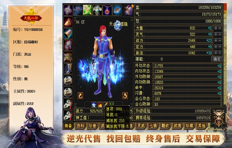 【TQY88856】 | 天山 | 等级:96 | 主属性:3001 | 副属性:222 | 男 | 主冰攻 | VIP3 | 畅游账号