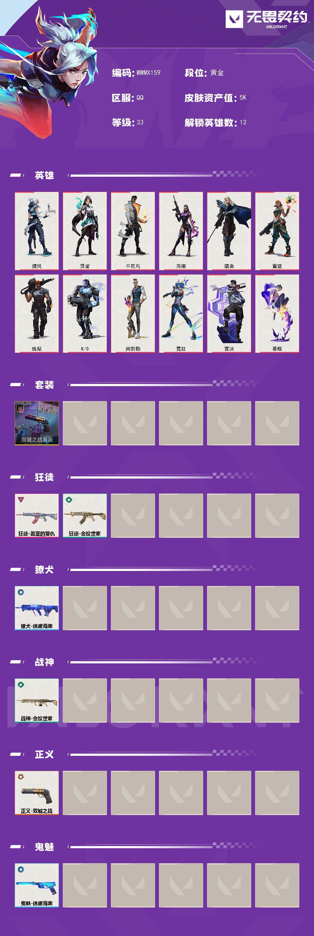 【WWMX159】【英雄】:捷风,贤者,不死鸟,芮娜,猎枭,雷兹,炼狱,K/O,尚勃勒,霓虹,壹决,暮蝶 【套装】:双城之战套装 【狂徒】:狂徒-盖亚的复仇,狂徒-金纹世家 【獠犬】:獠犬-迷邃海渊 【战神】:战神-金纹世家 【正义】:正义-双城之战 【鬼魅】:鬼魅-迷邃海渊 【卡面】:蛇吻设计图 卡面 /捷风/贤者/不死鸟/芮娜/猎枭/雷兹/炼狱/K/O/尚勃勒/霓虹/壹决/暮蝶/双城之战套