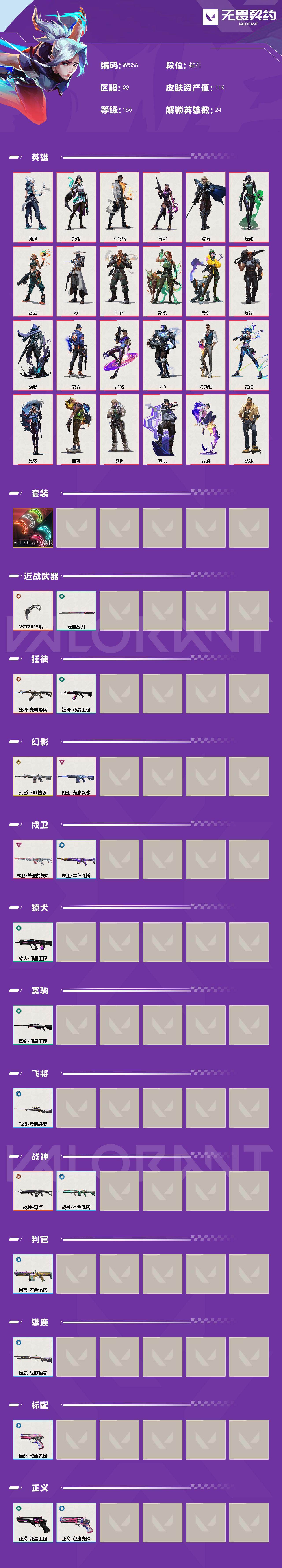 【WWS56】【英雄】:捷风,贤者,不死鸟,芮娜,猎枭,蝰蛇,雷兹,零,铁臂,斯凯,奇乐,炼狱,幽影,夜露,星礈,K/O,尚勃勒,霓虹,黑梦,盖可,钢锁,壹决,暮蝶,钛狐 【套装】:VCT 2025 爪刀套装 【近战武器】:近战武器-VCT 2025 爪刀,近战武器-源晶战刀 【狂徒】:狂徒-光明哨兵,狂徒-源晶工程 【幻影】:幻影-781协议,幻影-光息飘移 【戍卫】:戍卫-盖亚的复仇,戍卫