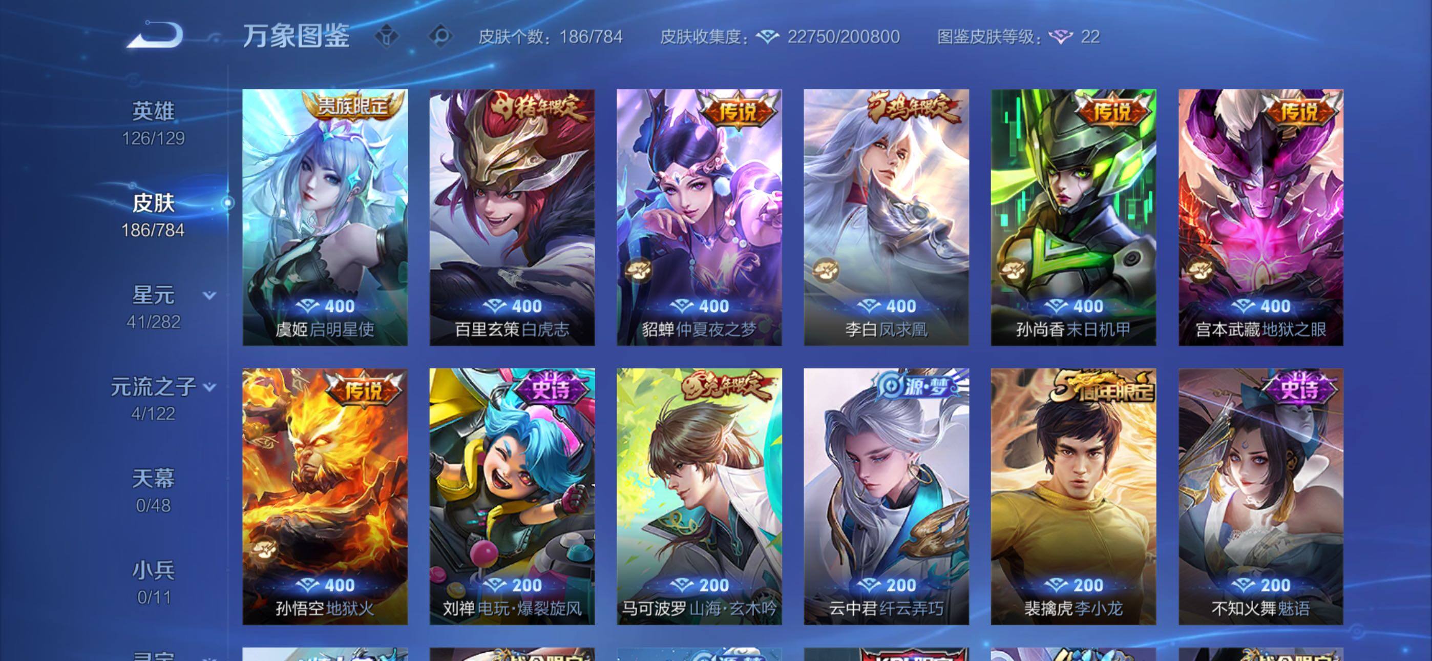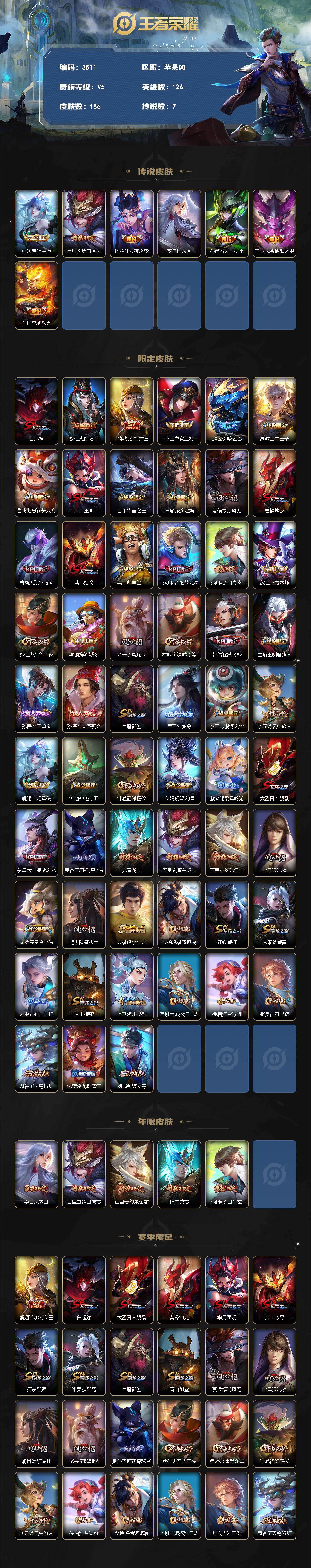 【WKY47082】 | 可排位 | 贵族5级 | 倔强青铜 | 英雄数量:126 | 皮肤数量:186 | 鬼谷子天穹祈灯,孙悟空大圣娶亲,夏侯惇朔风刀,典韦蓝屏警告,后羿如梦令,周瑜赤莲之焰,百里玄策白虎志,狂铁御狮,芈月重明,东皇太一逐梦之光,裴擒虎擒涛扼浪,鬼谷子原初探秘者,狄仁杰魔术师,赵云皇家上将,沈梦溪星空之诺,艾琳鹤鸣心笺,孙悟空至尊宝,吕布猎兽之王,韩信逐梦之影,沈梦溪龙舞盛年,米莱狄御霄,铠青龙志,项羽海滩派对,女娲朔望之晖,牛魔御旌,嬴政白昼王子,刘邦剑破天穹,百里守约朱雀志,曹操天狼征服者,虞姬凯尔特女王,弈星混沌棋,裴擒虎李小龙,曹操烛龙,鲁班大师探海日志,太乙真人饕餮,虞姬启明星使,老夫子醍醐杖,钟馗驱傩正仪,典韦穷奇,桑启海盐诗旅,亚瑟荣光之誓,白起狰,云中君纤云弄巧,明世隐疑决卦,兰陵王驯魔猎人,盾山御銮,李白凤求凰,马可波罗山海玄木吟,李元芳云中旅人,张良古海寻踪,程咬金演武夺筹,李元芳银河之约,狄仁杰万华元夜,钟馗神迹守卫,上官婉儿梁祝,马可波罗逐梦之星,鲁班七号狮舞东方,赵云引擎之心,芈月白晶晶,狄仁杰阴阳师,蔡文姬繁星吟游 | 诸葛亮黄金分割率,孙悟空大圣娶亲,典韦蓝屏警告,裴擒虎李小龙,后羿如梦令,吕布末日机甲,百里守约特工魅影,东皇太一逐梦之光,王昭君偶像歌手,夏侯惇乘风破浪,狄仁杰鹰眼统帅,狄仁杰魔术师,兰陵王暗隐猎兽者,云中君纤云弄巧,铠曙光守护者,露娜紫霞仙子,赵云皇家上将,兰陵王驯魔猎人,韩信白龙吟,李白千年之狐,不知火舞魅语,马可波罗山海玄木吟,孙悟空至尊宝,吕布圣诞狂欢,韩信逐梦之影,曹操幽灵船长,墨子金属风暴,孙策猫狗日记,铠青龙志,李元芳银河之约,孙尚香水果甜心,刘禅电玩爆裂旋风,嬴政白昼王子,墨子龙骑士,刘邦德古拉伯爵,花木兰水晶猎龙者,上官婉儿梁祝,百里守约朱雀志,马可波罗逐梦之星,曹操天狼征服者,鲁班七号狮舞东方,赵云引擎之心,妲己魅力维加斯,芈月白晶晶,阿轲节奏热浪,鲁班七号电玩小子,蔡文姬繁星吟游,大乔猫狗日记 | 孙尚香末日机甲,孙悟空地狱火,百里玄策白虎志,宫本武藏地狱之眼,虞姬启明星使,貂蝉仲夏夜之梦,李白凤求凰 | 钟无艳春野之旅,张良缤纷绘卷,妲己少女阿狸,张飞五福同心,鲁班七号黑桃队长,安琪拉玩偶对对碰,狂铁特工战影,甄姬花好人间,程咬金无双福将,诸葛亮掌控之力,孙悟空西部大镖客,宫本武藏霸王丸,明世隐虹云星官,达摩大发明家,鲁班大师乓乓大师,阿轲致命风华,沈梦溪龙舞盛年,老夫子功夫老勺,吕布野性能量,刘备万事如意,盾山圆桌骑士,孙膑天使之翼,典韦黄金武士,韩信街头霸王,钟无艳海滩丽影,蒙恬蔚蓝守将,宫本武藏万象初新,李白敏锐之力,关羽龙腾万里,花木兰兔女郎,孙膑归虚梦演,亚瑟死亡骑士,白起白色死神,姜子牙星梦巡礼,沈梦溪鲨炮海盗猫,张良幽兰居士,扁鹊化身博士,刘禅秘密基地,刘备纽约教父,王昭君幻想奇妙夜,廉颇功夫炙烤,刘备汉昭烈帝,赵云白执事,哪吒次元突破,后羿阿尔法小队,姜子牙炽热元素使,猪八戒潮玩探月行,韩信教廷特使,鬼谷子幻乐之宴,达摩拳王