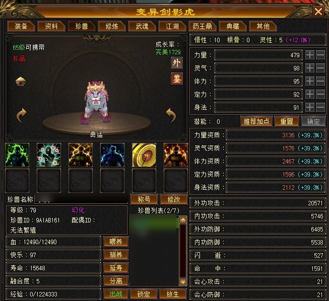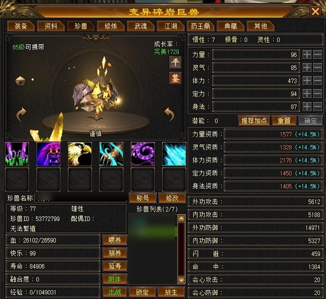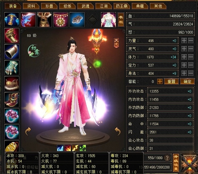 血量15.5W,主属性1505,满鼎副本随便刷,每天持续更新,带一个四属性附体宝宝和以一个血祭宝宝,背包里还有800YB,1000J。