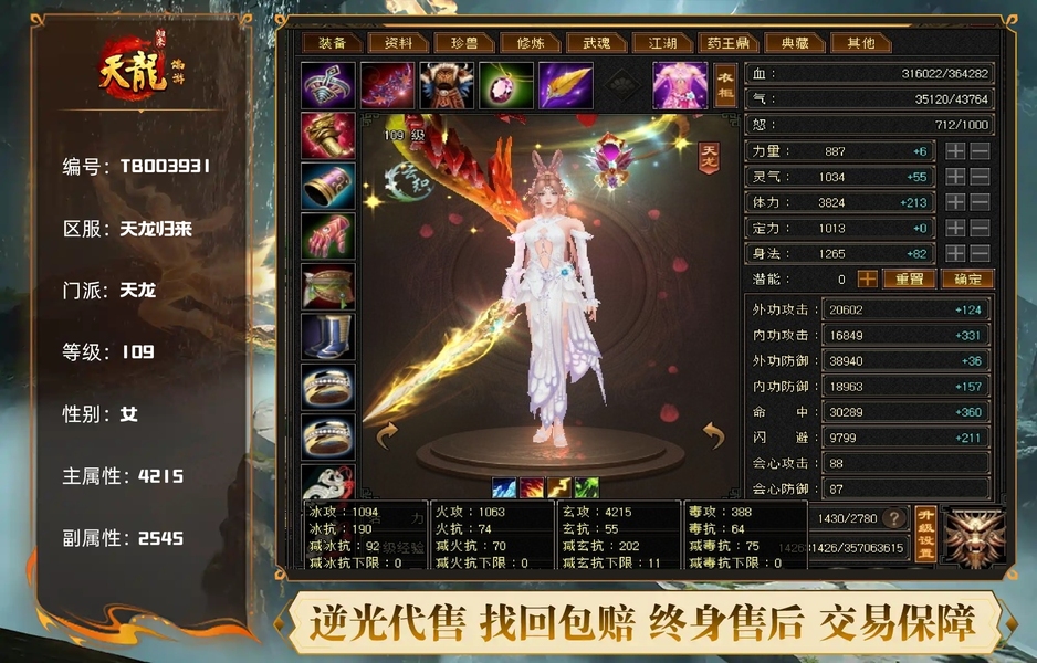 【TBO03931】 | 天龙 | 等级:109 | 主属性:4215 | 副属性:2545 | 女 | 主玄攻