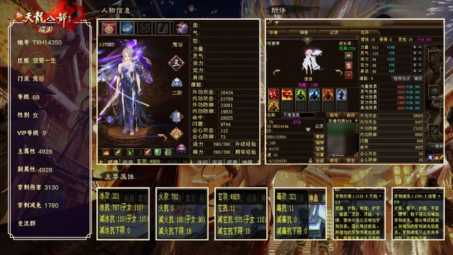 【TXH14350】 | 副属性:1424 | 评分:137073 | 穿刺减免:1780 | 等级:69 | 主属性:4928 | 穿刺伤害:3130 | 女 | VIP9 | 鬼谷 【买号找回永久包赔】