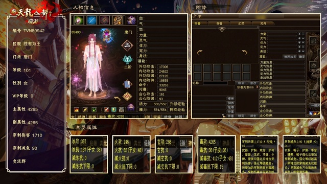 唐门 | 等级:101 | 主属性:4265 | 女 | 评分:66364 | 副属性:901 | 穿刺伤害:1710 | 穿刺减免:90 | VIP0 | 【买号找回永久包赔】