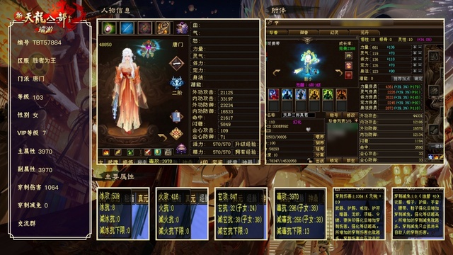 唐门 | 等级:103 | 主属性:3970 | 女 | 评分:48850 | 副属性:1772 | 穿刺伤害:1064 | 穿刺减免:0 | VIP7 | 【买号找回永久包赔】