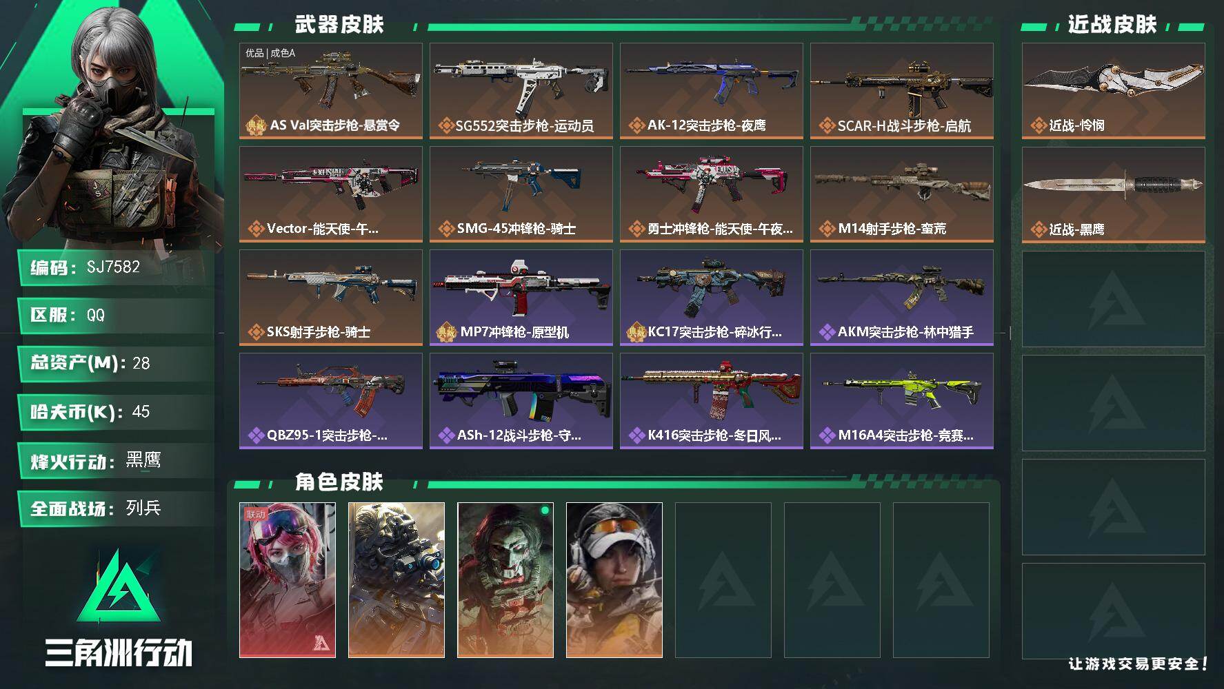 战场等级:9 | 行动等级:60 | 通行证等级:1 | 总资产:28M | 现有哈夫币:45W | 黑鹰,怜悯 | QBZ95-1突击步枪-曙光,AWM狙击步枪-流沙送葬,SCAR-H战斗步枪-启航,SG552突击步枪-深海恐惧,SVD狙击步枪-暗夜猎手,AKM突击步枪-林中猎手,Vector冲锋枪-百步穿杨,SVD狙击步枪-阿萨拉工艺,SG552突击步枪-运动员,KC17突击步枪-碎冰行动,MP5冲锋枪-深海恐惧,G3战斗步枪-流沙送葬,SR-25射手步枪-尖端治疗,M16A4突击步枪-竞赛选手,M700狙击步枪-守夜人,MP7冲锋枪-原型机,勇士冲锋枪-能天使-午夜邮差,Vector冲锋枪-能天使-午夜邮差,SV-98狙击步枪-囚徒,PTR-32突击步枪-英雄,Vector冲锋枪-猎鳄行动,M700狙击步枪-竞技风,AUG突击步枪-蝮蛇,Vector冲锋枪-阿萨拉文明,M700狙击步枪-百步穿杨,SG552突击步枪-尖端治疗,M1014霰弹枪-林中猎手,M7战斗步枪-百步穿杨,AK-12突击步枪-夜鹰 | 轮式突击炮-荣耀 | 能天使·午夜邮差 | 挂饰:挂饰-黑,挂饰-启程,挂饰-小羊,挂饰-维什戴尔,挂饰-能天使,挂饰-彩蛋