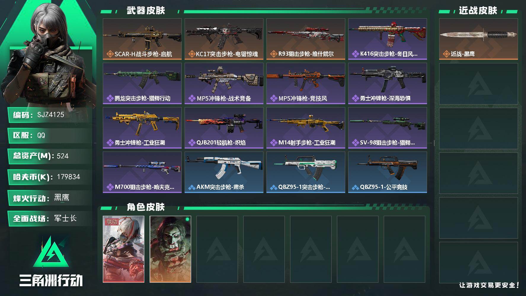 战场等级:20 | 行动等级:60 | 通行证等级:1 | 总资产:524M | 现有哈夫币:179834W | 黑鹰 | KC17突击步枪-电锯惊魂,勇士冲锋枪-深海恐惧,SV-98狙击步枪-猎鳄行动,SCAR-H战斗步枪-启航,R93狙击步枪-维什戴尔,MP5冲锋枪-战术竞备,勇士冲锋枪-工业狂潮 | M1A4坦克-驯鹿,轮式突击炮-荣耀 | 挂饰:挂饰-诡影喷火兵,挂饰-启程,挂饰-诡影狙击兵,挂饰-维什戴尔,挂饰-紧急会议