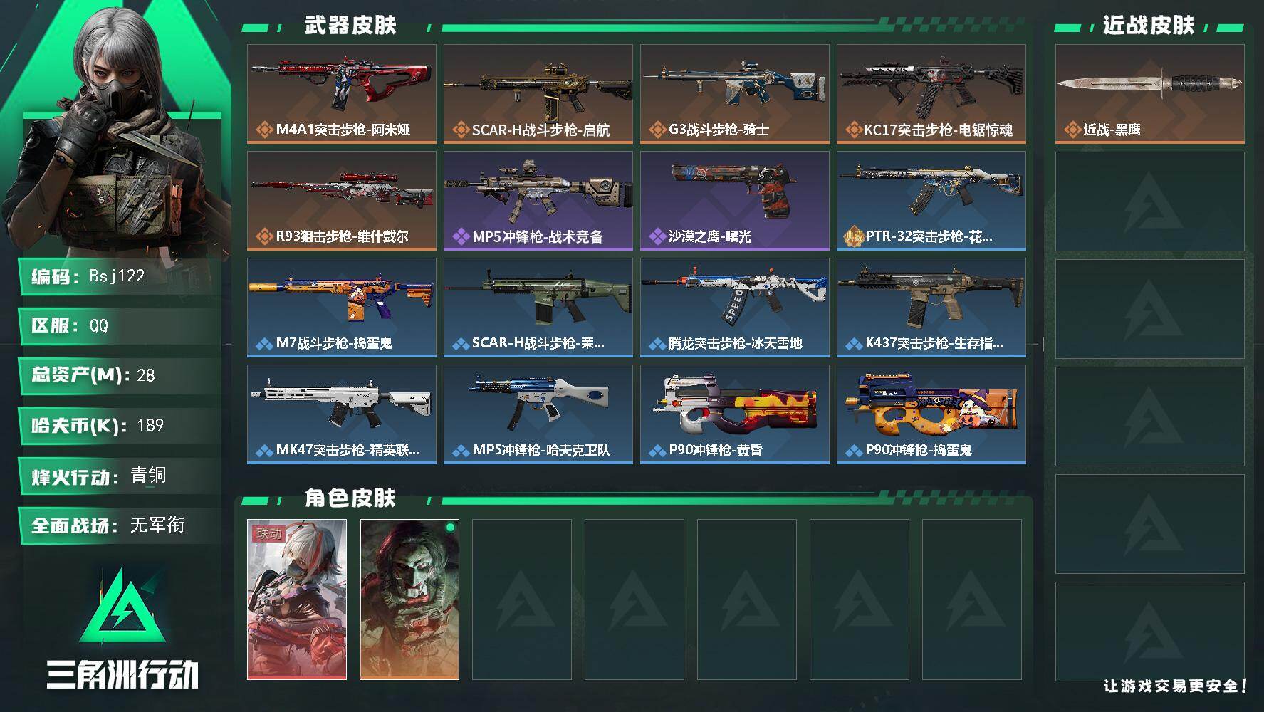 战场等级:1 | 行动等级:51 | 通行证等级:1 | 总资产:28M | 现有哈夫币:189W | 黑鹰 | KC17突击步枪-电锯惊魂,G3战斗步枪-骑士,SCAR-H战斗步枪-启航,M4A1突击步枪-阿米娅,R93狙击步枪-维什戴尔,MP5冲锋枪-战术竞备,沙漠之鹰-曙光 | 轮式突击炮-荣耀 | 挂饰:挂饰-诡影喷火兵,挂饰-启程,挂饰-维什戴尔,挂饰-紧急会议