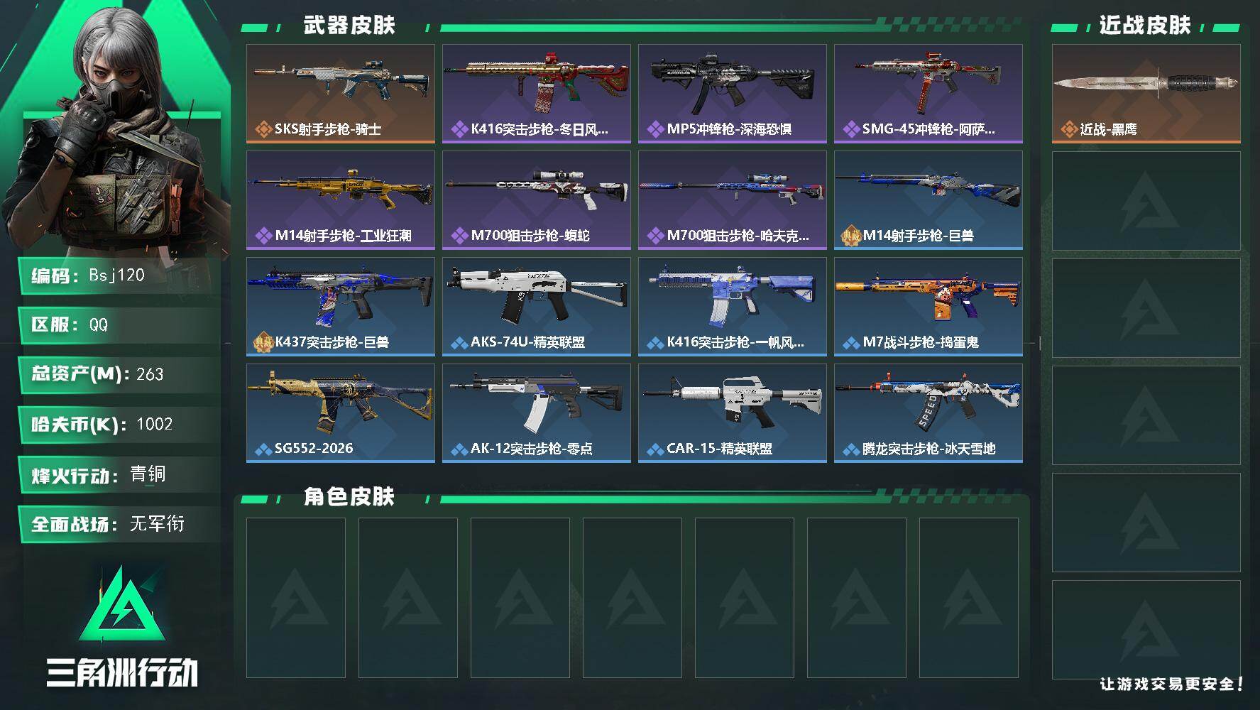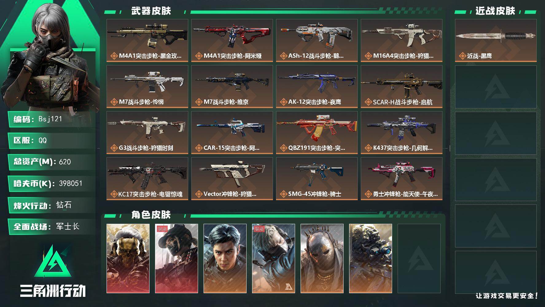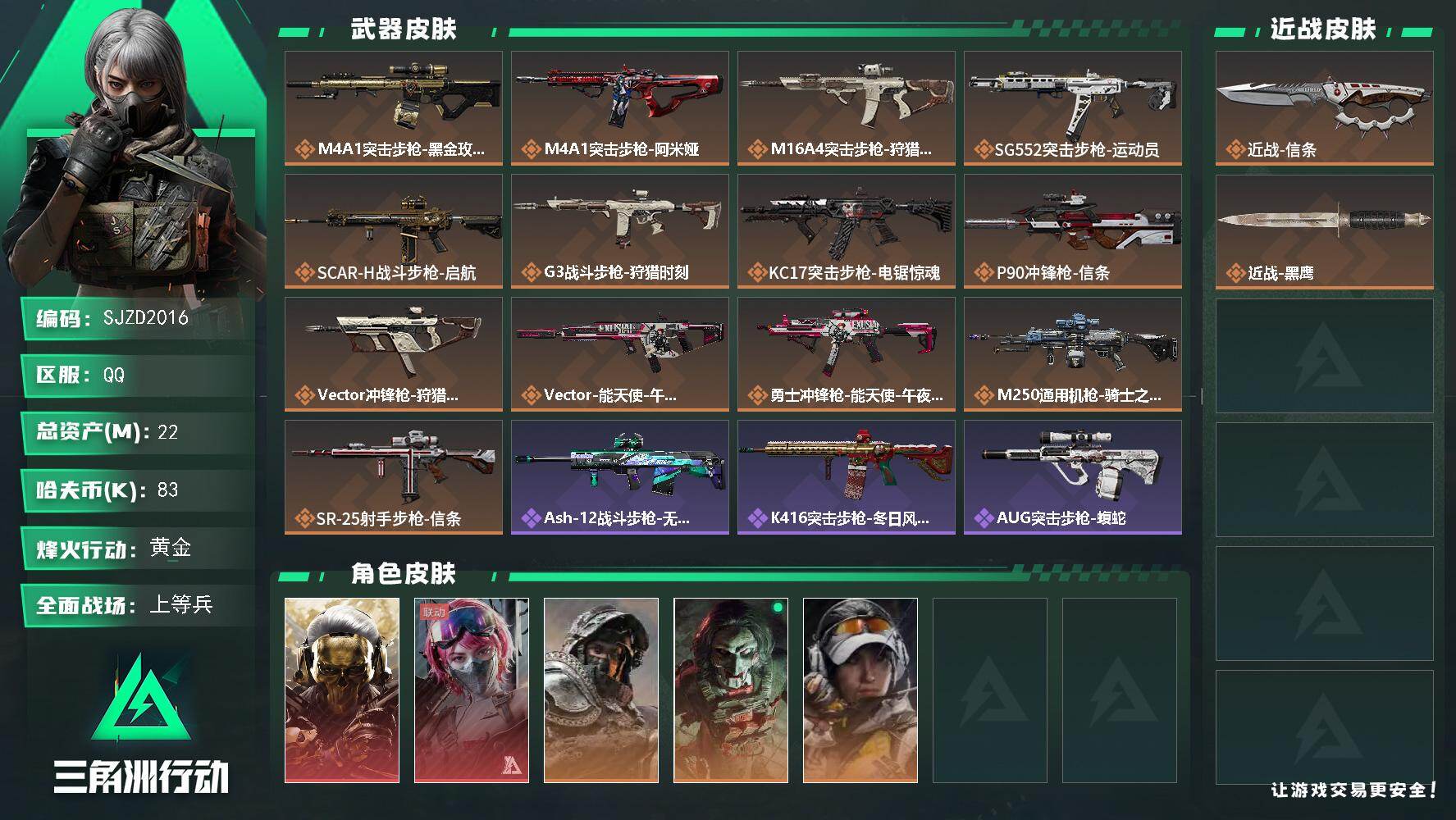 全面战场段位:无段位 | 烽火地带段位:铂金 | 战场等级:40 | 行动等级:60 | 通行证等级:5 | 总资产:233M | 现有哈夫币:7000W | 进阶安全箱 | 北极星,黑海,黑鹰 | K416突击步枪-命运 | 壮志凌云,电锯惊魂,金牌射手,送葬人·无题密令,飞虎,蚀金玫瑰,维什戴尔,水墨云图,能天使·午夜邮差,黑·天际线,夜鹰