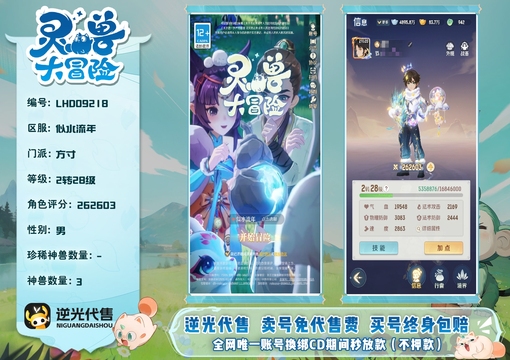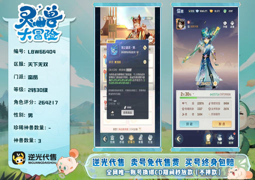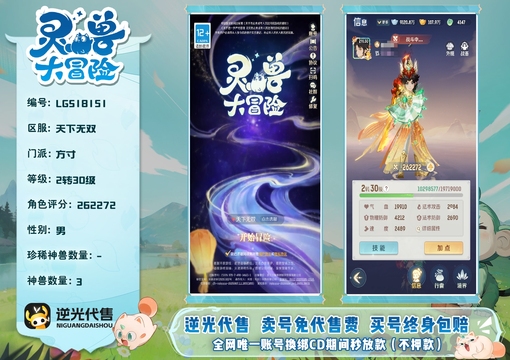 仙器:6 | 神兽数量:3 | 角色评分:264217 | 珍兽数量:3 | 等级:2转30级 | 蛮岳 | 男 | 貔貅,龙马 | 精卫,画中仙,孙悟空