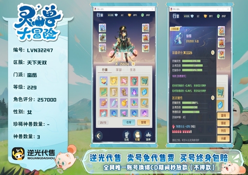 仙器:6 | 神兽数量:3 | 角色评分:257000 | 珍兽数量:3 | 等级:229 | 蛮岳 | 女 | 精卫,画中仙,孙悟空 | 貔貅,龙马