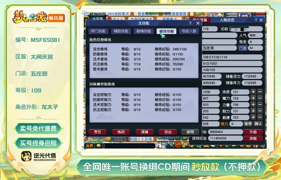 等级:109 | 五庄观,普陀山 | 无换绑CD | 无绿通 | 男 | 【逆光代售卖号0手续费】【买号找回永久包赔】