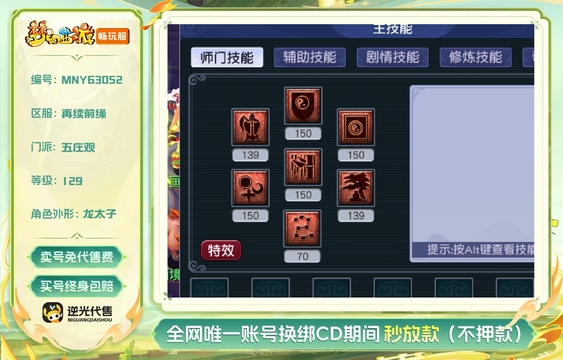 等级:129 | 五庄观,盘丝洞,普陀山 | 无换绑CD | 30天尊享特权 | 男 | 【逆光代售卖号0手续费】【买号找回永久包赔】