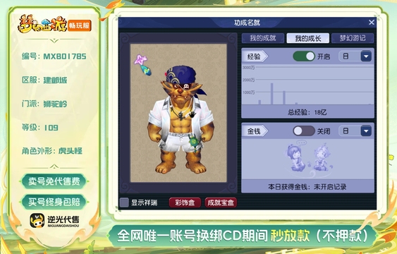 总经验:999999万 | 等级:109 | 狮驼岭 | 无换绑CD | 180天尊享特权 | 男 | 【逆光代售卖号0手续费】【买号找回永久包赔】