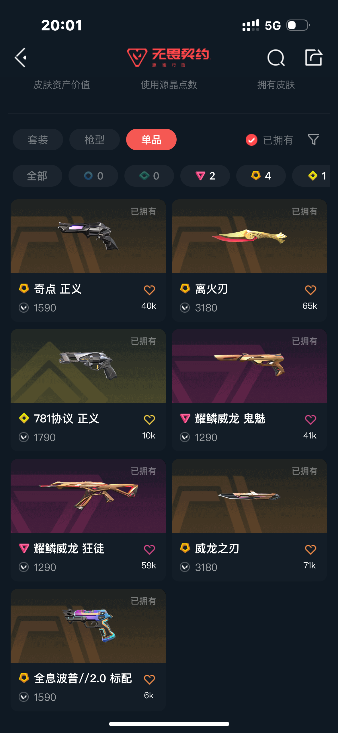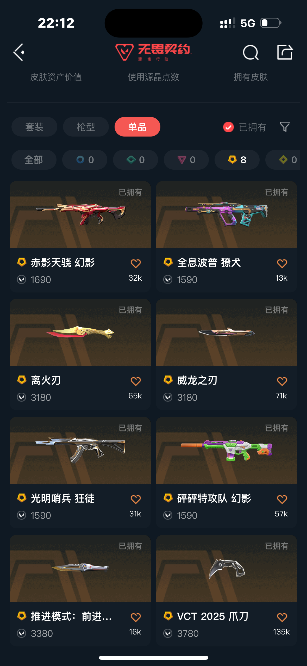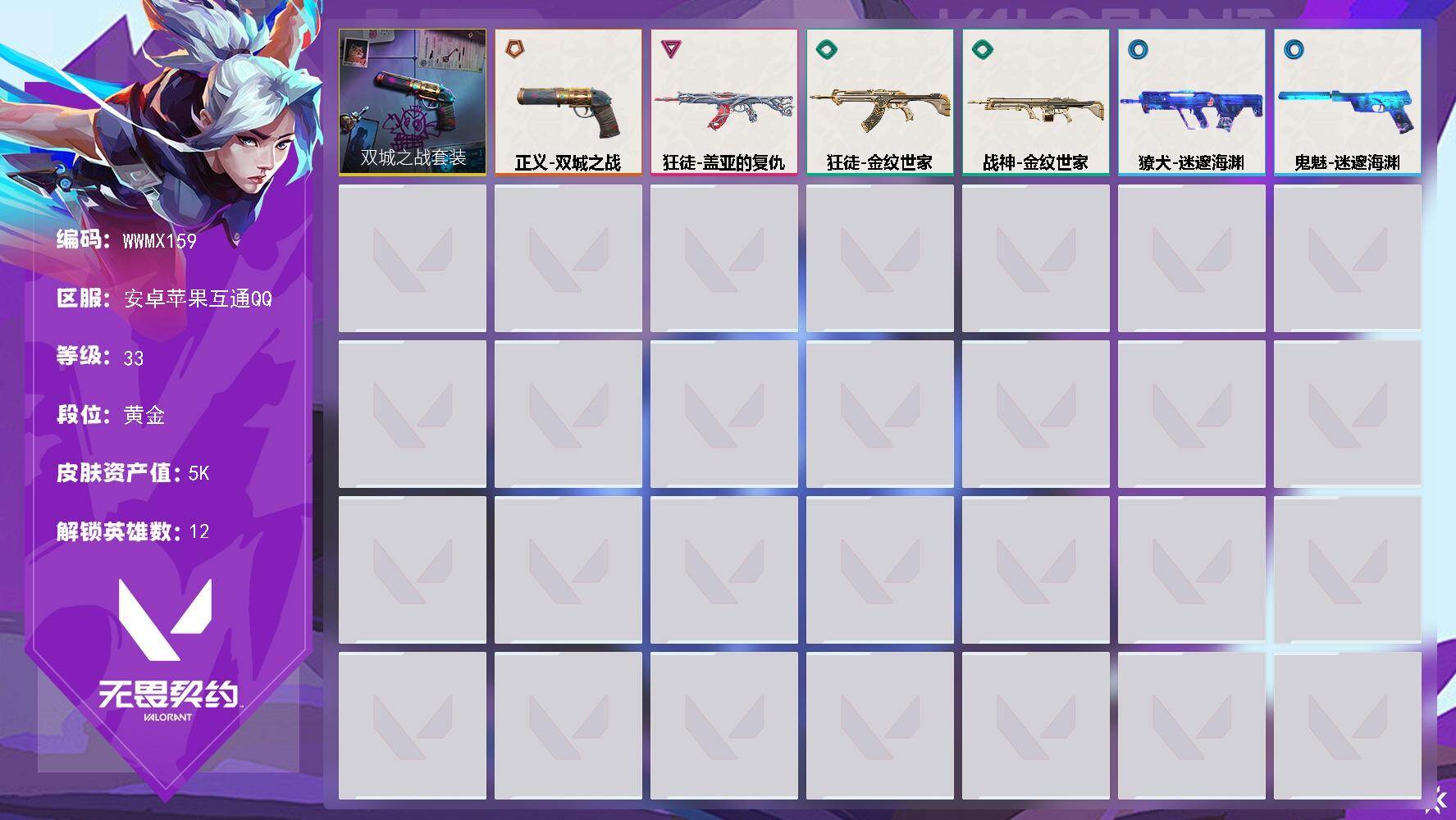等级:Lv172 | 超凡IV/刀皮数:6/枪皮数:48/ 【绝版皮肤】 近战武器-VCT2025爪刀 【近战武器】 近战武器-源晶战刀,近战武器-推进模式:前进四!,近战武器-离火刃,近战武器-威龙之刃,近战武器-青瓷花剑,近战武器-VCT2025爪刀 【步枪/狂徒】 狂徒-盖亚的复仇,狂徒-源晶工程,狂徒-耀鳞威龙,狂徒-氮气加速,狂徒-光明哨兵 【步枪/幻影】 幻影-781协议,幻影
