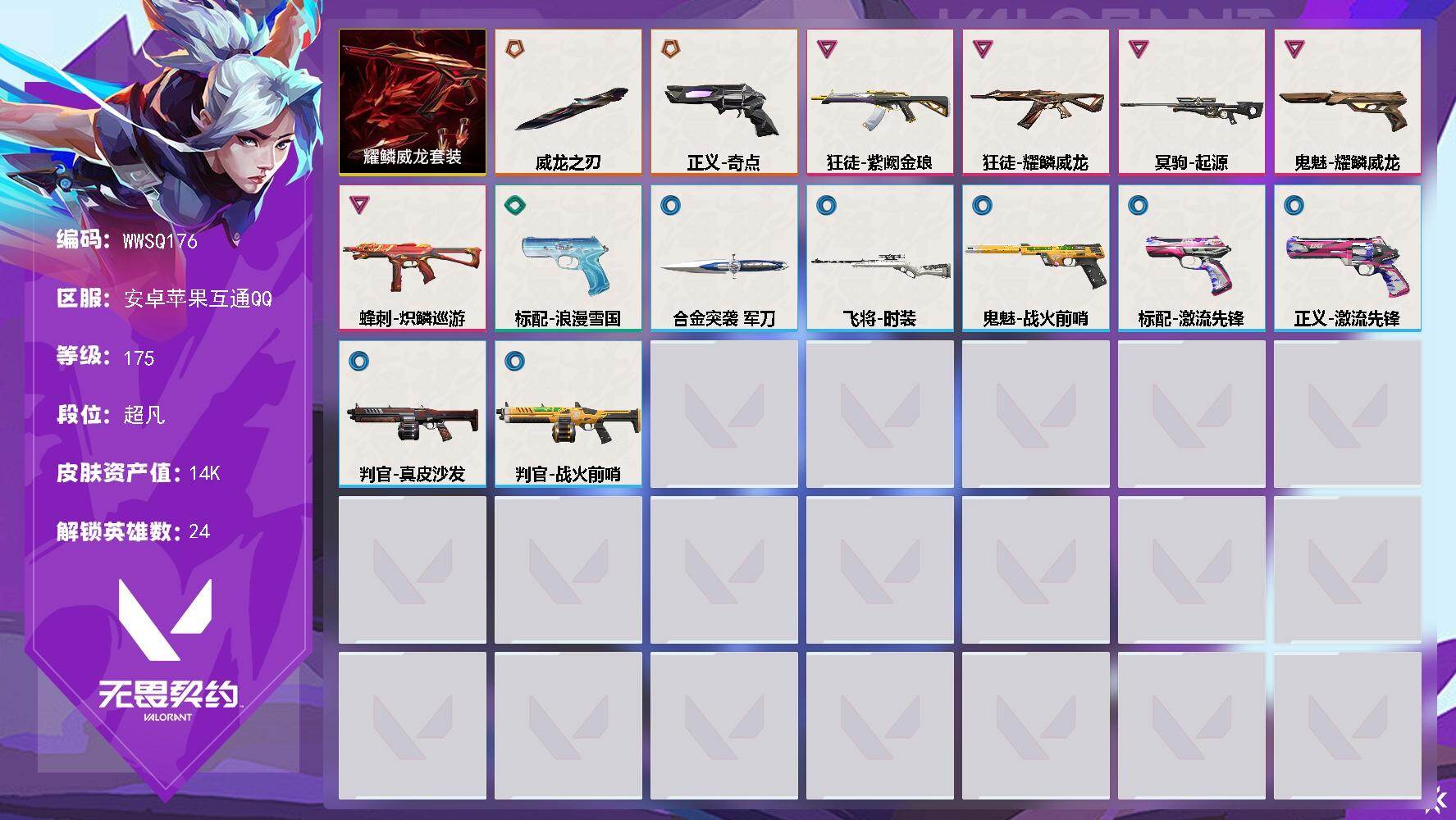 【WWSQ176】【英雄】:捷风,贤者,不死鸟,芮娜,猎枭,蝰蛇,雷兹,零,铁臂,斯凯,奇乐,炼狱,幽影,夜露,星礈,K/O,尚勃勒,霓虹,黑梦,盖可,钢锁,壹决,暮蝶,钛狐 【套装】:耀鳞威龙套装 【近战武器】:近战武器-威龙之刃,近战武器-合金突袭 军刀 【狂徒】:狂徒-紫阙金琅,狂徒-耀鳞威龙 【冥驹】:冥驹-起源 【飞将】:飞将-时装 【判官】:判官-真皮沙发,判官-战火前哨 【蜂刺】