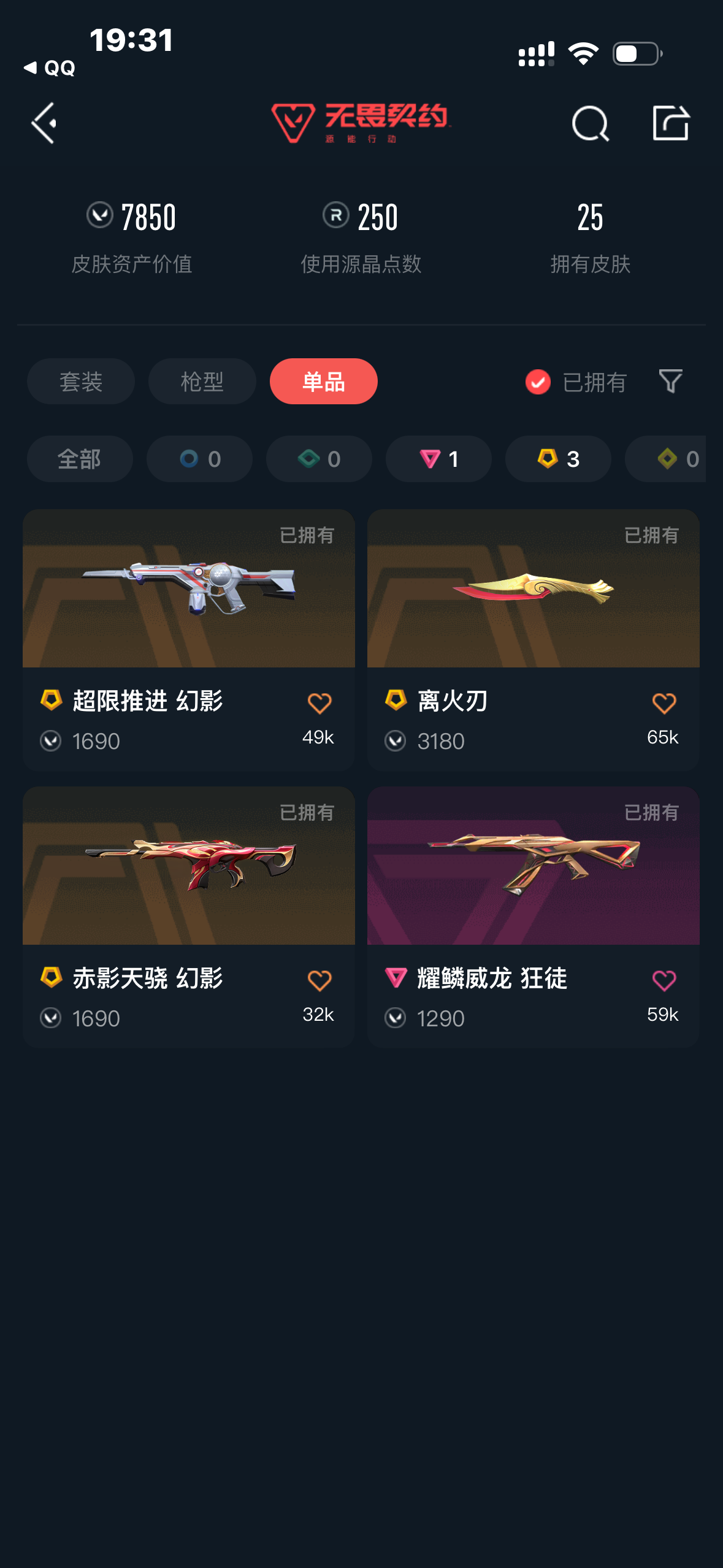 等级:Lv155 | 超凡II/刀皮数:2/枪皮数:23/ 【近战武器】 近战武器-离火刃,近战武器-青瓷花剑 【步枪/狂徒】 狂徒-耀鳞威龙,狂徒-氮气加速 【步枪/幻影】 幻影-超限推进,幻影-赤影天骁,幻影-匠心瓷绘,幻影-心动马力 【步枪/戍卫】 戍卫-氮气加速 【步枪/獠犬】 獠犬-迷邃海渊,獠犬-时装 【狙击枪/冥驹】 冥驹-氮气加速 【狙击枪/飞将】 飞将-匠心瓷绘,飞