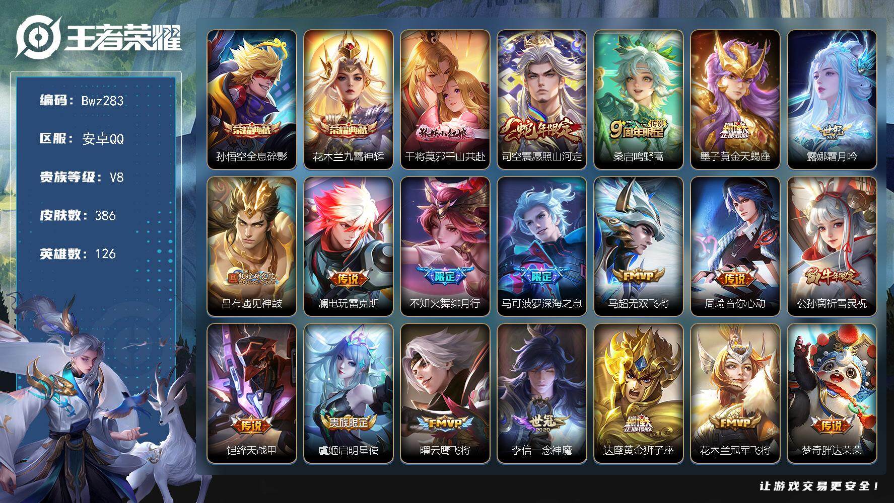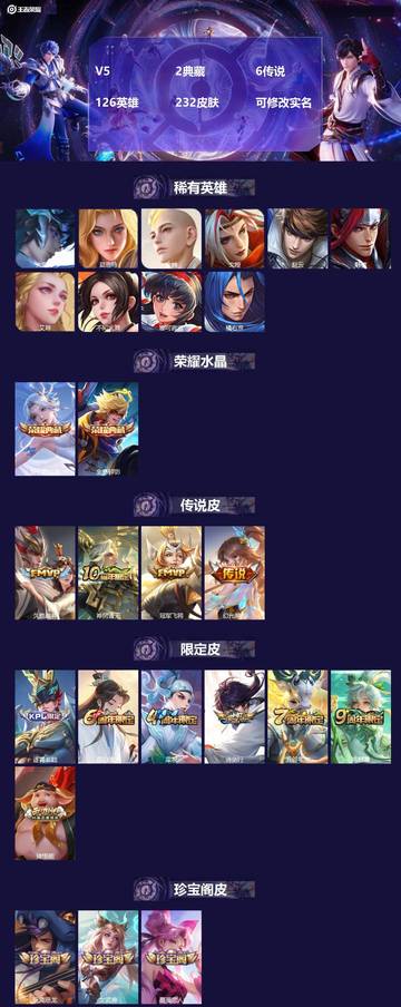 [16588923]V5 2典藏 6传说 126英雄 232皮肤 可修改实名 【英雄全皮】大禹全皮 【稀有英雄】大司命,韩信(韩跳跳),夏洛特(夏师傅),艾琳,橘右京(橘子),娜可露露(鸟人),不知火舞,赵云,金蝉(唐僧),戈娅 【荣耀水晶】最初的交响(伽罗典藏),全息碎影(猴子典藏) 【传说皮】神树通天,幻光神枪,冠军飞将,久胜战神 【珍宝阁皮】蔷薇恋人,女武神,玩趣恶龙 【赛季/战令皮】噬灭天穹(s37),古海寻踪(s33),海盐诗旅(s30),擒涛扼浪(s31),探海日志(s32),顽趣-梦奇,剑破天穹(s35),天穹祈灯(s34),天穹之誓(s36),御銮(s16