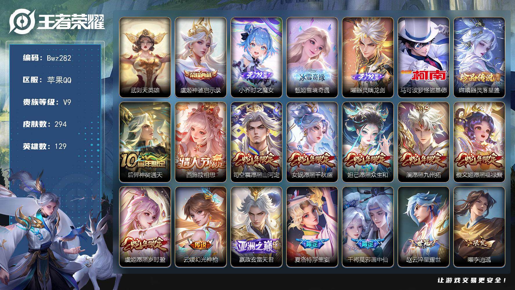 英雄数量:129 | 皮肤数量:294 | 未用荣耀水晶数量:0 | 武则天 | 武则天 | 马可波罗怪盗基德,嫦娥器灵·落星盏 | 小乔时之魔女,曜器灵·螭龙剑,甄姬雪境奇遇 | 虞姬神鉴启示录 | 鬼谷子天穹祈灯,孙悟空大圣娶亲,夏侯惇朔风刀,少司缘巫礼祀神,沈梦溪大漠名商,狂铁御狮,后羿辉光之辰,女娲愿照·千秋盛,孙膑茶境仙,百里玄策原初追逐者,芈月重明,甄姬雪境奇遇,孙尚香蔷薇恋人,明世隐往忆晖光,裴擒虎擒涛扼浪,鬼谷子原初探秘者,狄仁杰魔术师,莱西奥光弋星穹,嫦娥拒霜思,鬼谷子克喵,赵云皇家上将,后羿神树通天,艾琳鹤鸣心笺,夏洛特浮生妄,孙悟空至尊宝,吕布猎兽之王,沈梦溪龙舞盛年,米莱狄御霄,项羽海滩派对,牛魔御旌,嬴政白昼王子,苏烈千军破阵,马超访茗客,曜李逍遥,曹操逐霄之志,关羽冰锋战神,虞姬凯尔特女王,赵怀真器灵·浮梦炉,弈星混沌棋,西施织梦人,诸葛亮时雨天司,曹操烛龙,西施续相思,太乙真人饕餮,虞姬启明星使,老夫子醍醐杖,钟馗驱傩正仪,虞姬愿照·岁时盈,孙膑妖精王,妲己愿照·众生和,典韦穷奇,桑启海盐诗旅,达摩沙漠行僧,亚瑟荣光之誓,小乔时之魔女,庄周高山流水,白起狰,明世隐疑决卦,雅典娜黎明之约,李元芳云中旅人,貂蝉逐梦之音,程咬金演武夺筹,阿古朵江河有灵,鬼谷子五谷丰年,干将莫邪画中仙,狄仁杰万华元夜,吕布天魔缭乱,周瑜线条小狗,赵云引擎之心,狄仁杰阴阳师,司空震愿照·山河定,澜愿照·九州拓,兰陵王金庭之子 | 吕布猎兽之王,周瑜百相守梦,莱西奥光弋星穹,马超访茗客,孙策百相守梦,孙膑茶境仙,嬴政白昼王子,明世隐往忆晖光 | 鬼谷子天穹祈灯,夏侯惇朔风刀,沈梦溪大漠名商,曹操烛龙,狂铁御狮,太乙真人饕餮,老夫子醍醐杖,百里玄策原初追逐者,芈月重明,钟馗驱傩正仪,孙膑妖精王,典韦穷奇,裴擒虎擒涛扼浪,鬼谷子原初探秘者,甄姬逆浪荇歌,桑启海盐诗旅,达摩沙漠行僧,亚瑟荣光之誓,东皇太一噬灭天穹,白起狰,明世隐疑决卦,雅典娜黎明之约,李元芳云中旅人,程咬金演武夺筹,太乙真人谧流熔炉,米莱狄御霄,狄仁杰万华元夜,牛魔御旌,苏烈千军破阵,虞姬凯尔特女王,兰陵王金庭之子 | 孙悟空大圣娶亲,亚瑟心灵战警,宫本武藏鬼剑武藏,雅典娜冰冠公主,亚连糖绘人间,后羿辉光之辰,百里玄策原初追逐者,项羽九幽镇关,王昭君偶像歌手,孙尚香蔷薇恋人,张飞乱世虎臣,狄仁杰鹰眼统帅,狄仁杰魔术师,嫦娥拒霜思,赵云皇家上将,韩信白龙吟,刘禅天才门将,孙悟空至尊宝,曹操幽灵船长,墨子金属风暴,黄忠百相守梦,嬴政白昼王子,貂蝉圣诞恋歌,阿轲化蝶舞,白起星夜王子,扁鹊灵蛊蚀心,橘右京修罗,狄仁杰绮世丹青,妲己魅力维加斯,关羽冰锋战神,嬴政暗夜贵公子,大乔猫狗日记,小乔缤纷独角兽,赵云未来纪元,吕布末日机甲,百里守约特工魅影,夏侯惇乘风破浪,嬴政摇滚巨星,沈梦溪月团寄思,庄周高山流水,兰陵王暗隐猎兽者,露娜紫霞仙子,莱西奥末日机甲,李元芳逐浪之夏,雅典娜黎明之约,安琪拉心灵骇客,程咬金功夫厨神,貂蝉逐梦之音,吕布圣诞狂欢,阿古朵江河有灵,鬼谷子五谷丰年,孙尚香水果甜心,赵云引擎之心,狂铁龙之律动,苍狼魂孤将,项羽苍穹之光,阿轲节奏热浪,甄姬冰雪圆舞曲 | 诸葛亮时雨天司,孙悟空地狱火,西施续相思,宫本武藏地狱之眼,虞姬启明星使,女娲愿照·千秋盛,虞姬愿照·岁时盈,妲己愿照·众生和,云缨幻光神枪,孙尚香末日机甲,狄仁杰超时空战士,貂蝉仲夏夜之梦,镜炽阳神光,夏洛特浮生妄,干将莫邪久胜战神,后羿黄金射手座,干将莫邪画中仙,赵云淬星耀世,蔡文姬愿照·福禄聚,吕布天魔缭乱,嬴政玄雷天君,张良黄金白羊座,李信一念神魔,嫦娥器灵·落星盏,司空震愿照·山河定,澜愿照·九州拓,曜李逍遥,武则天海洋之心 | 孙尚香蔷薇恋人 | 公孙离花间舞,张飞五福同心,后羿完美运算,沈梦溪棒球奇才,甄姬花好人间,伽罗花见巫女,杨戬埃及法老,程咬金无双福将,孙膑未来旅行,小乔万圣前夜,司空震启蛰,诸葛亮掌控之力,米莱狄精准探案法,梦奇美梦成真,李信灼热之刃,露娜命运加冕,沈梦溪龙舞盛年,孙尚香沉稳之力,司马懿魇语军师,明世隐占星师,东皇太一金福满堂,宫本武藏未来纪元,鲁班七号福禄兄弟,亚连破局者,孙权径山谋武,刘备浪漫序章,老夫子功夫老勺,刘备万事如意,暃碧珀绯影,孙膑天使之翼,典韦黄金武士,马超幸存者,瑶森,鲁班七号木偶奇遇记,哪吒三太子,马可波罗激情绿茵,高渐离金属狂潮,蒙恬蔚蓝守将,宫本武藏万象初新,程咬金星际陆战队,关羽龙腾万里,刘禅英喵野望,裴擒虎街头旋风,花木兰兔女郎,盘古创世神祝,姬小满小满鸭,项羽帝国元帅,诸葛亮星航指挥官,钟无艳生化警戒,白起白色死神,金蝉前尘,姜子牙时尚教父,程咬金爱与正义,夏侯惇战争骑士,达摩爆裂喵拳,姬小满零食大作战,老夫子潮流仙人,钟馗虚灵犬护,牛魔西部大镖客,狂铁命运角斗场,云中君云械蓝图,刘禅秘密基地,貂蝉异域舞娘,狄仁杰锦衣卫,桑启画中游,廉颇功夫炙烤,上官婉儿修竹墨客,关羽天启骑士,刘备汉昭烈帝,曹操死神来了,高渐离落日弦歌,澜孤猎,露娜绯红之刃,哪吒罗小黑战记,猪八戒潮玩探月行,镜冰刃幻境,赵云忍炎影,影魅影绮裳,蒙犽胡桃狂想曲,鬼谷子幻乐之宴,达摩拳王,曜归虚梦演,妲己少女阿狸,嫦娥露花倒影,云缨赤焰之缨,安琪拉玩偶对对碰,狂铁特工战影,阿古朵熊喵少女,后羿精灵王,弈星踏雪寻梅,王昭
