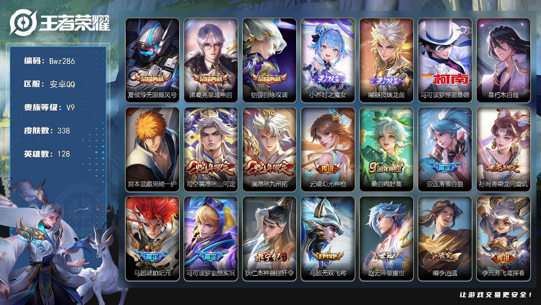英雄数量:128 | 皮肤数量:338 | 未用荣耀水晶数量:0 | 马可波罗怪盗基德,暃朽木白哉,宫本武藏黑崎一护 | 小乔时之魔女,曜器灵·螭龙剑 | 夏侯惇无限飓风号,凯银白咏叹调,诸葛亮星域神启 | 马超琥珀纪元,鬼谷子天穹祈灯,后羿如梦令,周瑜赤莲之焰,上官婉儿天狼绘梦者,孙膑茶境仙,百里玄策原初追逐者,东皇太一逐梦之光,伽罗天狼溯光者,梦奇顽趣,公孙离祈雪灵祝,韩信飞衡,嫦娥拒霜思,鬼谷子克喵,赵云皇家上将,达摩星际陆战队,墨子神迹守卫,高渐离燃音魔法,项羽苍威无极,项羽海滩派对,海诺心动手记,上官婉儿群星魔术团,苏烈千军破阵,马可波罗妄想实况,亚连落雪白狼,百里玄策罗小黑战记,曜李逍遥,太乙真人华丽摇滚,吕布御风骁将,弈星混沌棋,安琪拉魔法小厨娘,鲁班七号乒乒小将,西施织梦人,裴擒虎李小龙,虞姬启明星使,花木兰青春决赛季,老夫子醍醐杖,钟馗驱傩正仪,米莱狄胡桃异想国,亚瑟荣光之誓,关羽武圣,明世隐疑决卦,雅典娜单词大作战,鲁班七号蔬乡物语,李元芳云中旅人,亚瑟潮玩骑士王,张良古海寻踪,程咬金演武夺筹,牛魔奔雷神使,李元芳银河之约,钟馗神迹守卫,司空震地狱燃心,狄仁杰神器狴犴令,安琪拉乘龙聚宝船,杨戬潮玩骑兵,赵云引擎之心,芈月白晶晶,澜愿照·九州拓,兰陵王金庭之子,妲己灵卜魔法,花木兰默契交锋,沈梦溪大漠名商,蒙犽狂想玩偶喵,周瑜熔金海岸,女娲万灵启世,公孙离玉兔公主,鬼谷子原初探秘者,狄仁杰魔术师,沈梦溪星空之诺,元歌无心,艾琳鹤鸣心笺,妲己时之彼端,孙悟空至尊宝,镜青焰无极,刘邦剑破天穹,马可波罗暗影游猎,马超访茗客,典韦岱宗,赵怀真器灵·浮梦炉,诸葛亮时雨天司,艾琳陌上桑,元歌云间偶戏,达摩沙漠行僧,李元芳蔬乡物语,李白谪仙醉月,小乔时之魔女,艾琳女武神,刘备异域游侠,云中君纤云弄巧,孙尚香乘龙问璇玑,盾山御銮,雅典娜黎明之约,老夫子航海奇遇记,芈月浮光幕影,高渐离玩趣恶龙,马超神威,狄仁杰万华元夜,程咬金群星魔术团,周瑜线条小狗,猪八戒西部大镖客,狄仁杰阴阳师,司空震愿照·山河定 | 老夫子百相守梦,妲己灵卜魔法,蒙犽狂想玩偶喵,周瑜赤莲之焰,孙膑茶境仙,米莱狄胡桃异想国,元歌云间偶戏,虞姬夏日便利店,李元芳蔬乡物语,达摩星际陆战队,蔡文姬夏日便利店,沈梦溪星空之诺,墨子神迹守卫,雅典娜单词大作战,鲁班七号蔬乡物语,高渐离燃音魔法,老夫子航海奇遇记,亚瑟潮玩骑士王,项羽苍威无极,镜青焰无极,李元芳银河之约,钟馗神迹守卫,亚连破空之剑,司空震地狱燃心,猪八戒西部大镖客,马可波罗暗影游猎,杨戬潮玩骑兵,孙悟空神迹守卫,马超访茗客,百里守约百相守梦 | 鬼谷子天穹祈灯,李元芳云中旅人,张良古海寻踪,程咬金演武夺筹,沈梦溪大漠名商,太乙真人谧流熔炉,老夫子醍醐杖,狄仁杰万华元夜,百里玄策原初追逐者,钟馗驱傩正仪,刘邦剑破天穹,姜子牙天穹之誓,鬼谷子原初探秘者,甄姬逆浪荇歌,达摩沙漠行僧,亚瑟荣光之誓,梦奇顽趣,苏烈千军破阵,东皇太一噬灭天穹,明世隐疑决卦,盾山御銮,雅典娜黎明之约,兰陵王金庭之子,牛魔星界战将 | 司马懿暗渊魔法,后羿如梦令,上官婉儿天狼绘梦者,百里玄策原初追逐者,大乔白蛇,东皇太一逐梦之光,项羽九幽镇关,伽罗天狼溯光者,梦奇顽趣,韩信飞衡,嫦娥拒霜思,赵云皇家上将,高渐离燃音魔法,钟馗乐园奇幻夜,墨子金属风暴,孙尚香时之恋人,貂蝉圣诞恋歌,海诺心动手记,哪吒雪上飞焰,白起星夜王子,上官婉儿群星魔术团,妲己魅力维加斯,吕布御风骁将,嬴政暗夜贵公子,安琪拉魔法小厨娘,鲁班七号乒乒小将,伽罗箭羽风息,裴擒虎李小龙,吕布末日机甲,花木兰青春决赛季,米莱狄胡桃异想国,夏侯惇乘风破浪,澜赏金猎手,嬴政摇滚巨星,沈梦溪月团寄思,廉颇地狱岩魂,姬小满战舞者,露娜紫霞仙子,李元芳逐浪之夏,鲁班七号蔬乡物语,刘禅绅士熊喵,程咬金功夫厨神,牛魔奔雷神使,李元芳银河之约,孙尚香水果甜心,墨子龙骑士,艾琳奇遇舞章,刘邦德古拉伯爵,司空震地狱燃心,安琪拉乘龙聚宝船,赵云引擎之心,芈月白晶晶,项羽苍穹之光,妲己灵卜魔法,花木兰默契交锋,夏洛特永昼,亚瑟心灵战警,宫本武藏鬼剑武藏,蒙犽狂想玩偶喵,雅典娜冰冠公主,后羿石田雨龙,蒙犽龙鼓争鸣,王昭君偶像歌手,公孙离玉兔公主,西施诗语江南,张飞乱世虎臣,狄仁杰鹰眼统帅,狄仁杰魔术师,刘禅鸭鸭历险记,李白千年之狐,元歌无心,刘禅天才门将,妲己时之彼端,公孙离无限星赏官,孙悟空至尊宝,曹操幽灵船长,黄忠百相守梦,娜可露露晚萤,阿轲化蝶舞,马可波罗暗影游猎,橘右京修罗,典韦岱宗,大乔猫狗日记,诸葛亮黄金分割率,小乔缤纷独角兽,赵云未来纪元,貂蝉唤灵魅影,妲己女仆咖啡,百里守约特工魅影,元歌云间偶戏,兰陵王暗隐猎兽者,云中君纤云弄巧,铠曙光守护者,雅典娜黎明之约,不知火舞魅语,安琪拉心灵骇客,老夫子航海奇遇记,芈月浮光幕影,吕布圣诞狂欢,蔡文姬舞动绿茵,马超神威,孙策猫狗日记,百里玄策热力回旋,花木兰水晶猎龙者,狂铁龙之律动,阿轲节奏热浪,鲁班七号电玩小子,甄姬冰雪圆舞曲 | 马超琥珀纪元,诸葛亮时雨天司,宫本武藏地狱之眼,虞姬启明星使,虞姬云霓雀翎,云缨幻光神枪,马超无双飞将,关羽武圣,曜云鹰飞将,公孙离祈雪灵祝,狄仁杰超时空战士,孙尚香乘龙问璇玑,镜炽阳神光,达摩黄金狮子座,干将莫邪久胜战神,刘备时之恋人,