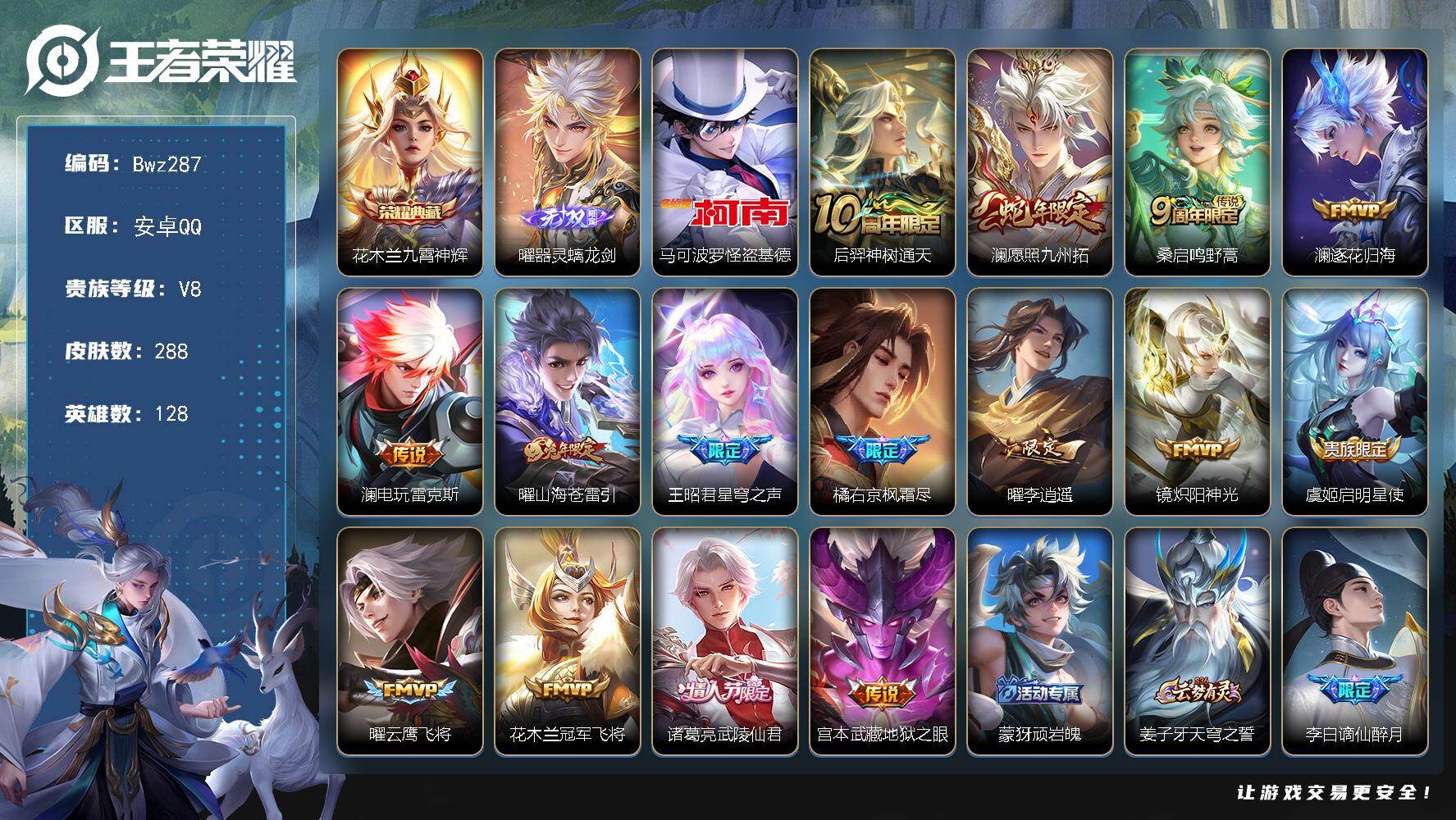 英雄数量:128 | 皮肤数量:288 | 未用荣耀水晶数量:0 | 马可波罗怪盗基德 | 曜器灵·螭龙剑 | 花木兰九霄神辉 | 鬼谷子天穹祈灯,妲己灵卜魔法,沈梦溪大漠名商,后羿如梦令,嫦娥漠中幻影,周瑜熔金海岸,猪八戒猪悟能,弈星万物之道,百里玄策原初追逐者,女娲万灵启世,裴擒虎擒涛扼浪,梦奇顽趣,狄仁杰魔术师,嫦娥拒霜思,鬼谷子克喵,扁鹊奇幻香踪,赵云皇家上将,后羿神树通天,蒙犽百解令,元歌无心,艾琳鹤鸣心笺,戈娅驭风魔法,高渐离燃音魔法,项羽苍威无极,镜青焰无极,沈梦溪龙舞盛年,公孙离涂山容容,项羽海滩派对,西施玲珑珍味,刘邦剑破天穹,姬小满妄想食味,王昭君星穹之声,曜李逍遥,赵怀真器灵·浮梦炉,西施织梦人,裴擒虎李小龙,鲁班大师探海日志,虞姬启明星使,蒙恬荣光圣徽,钟馗驱傩正仪,橘右京枫霜尽,蒙犽顽岩魄,元歌云间偶戏,桑启海盐诗旅,达摩沙漠行僧,亚瑟荣光之誓,李元芳蔬乡物语,李白谪仙醉月,刘备异域游侠,云中君纤云弄巧,阿轲迷踪丽影,雅典娜单词大作战,鲁班七号蔬乡物语,雅典娜黎明之约,李元芳云中旅人,诸葛亮武陵仙君,张良古海寻踪,高渐离玩趣恶龙,程咬金演武夺筹,阿古朵江河有灵,鬼谷子五谷丰年,狄仁杰万华元夜,程咬金群星魔术团,曜山海苍雷引,周瑜线条小狗,司空震地狱燃心,嫦娥暖冬兔眠,艾琳流音漫舞,杨戬潮玩骑兵,狄仁杰阴阳师,张良罗小黑战记,孙悟空孙行者,澜愿照·九州拓,吕布逐霄战戟,暃星界游侠,蔡文姬繁星吟游,兰陵王金庭之子 | 高渐离燃音魔法,老夫子百相守梦,妲己灵卜魔法,项羽苍威无极,镜青焰无极,西施玲珑珍味,司空震地狱燃心,嫦娥暖冬兔眠,艾琳流音漫舞,元歌云间偶戏,李元芳蔬乡物语,杨戬潮玩骑兵,扁鹊奇幻香踪,阿轲迷踪丽影,百里守约百相守梦,暃星界游侠,雅典娜单词大作战,鲁班七号蔬乡物语,戈娅驭风魔法 | 鬼谷子天穹祈灯,李元芳云中旅人,张良古海寻踪,程咬金演武夺筹,沈梦溪大漠名商,太乙真人谧流熔炉,鲁班大师探海日志,小乔线条小狗,狄仁杰万华元夜,百里玄策原初追逐者,蒙恬荣光圣徽,钟馗驱傩正仪,刘邦剑破天穹,姜子牙天穹之誓,裴擒虎擒涛扼浪,甄姬逆浪荇歌,桑启海盐诗旅,达摩沙漠行僧,亚瑟荣光之誓,梦奇顽趣,东皇太一噬灭天穹,雅典娜黎明之约,兰陵王金庭之子,牛魔星界战将 | 妲己灵卜魔法,亚瑟心灵战警,宫本武藏鬼剑武藏,后羿如梦令,猪八戒猪悟能,雅典娜冰冠公主,百里玄策原初追逐者,项羽九幽镇关,王昭君偶像歌手,狄仁杰鹰眼统帅,梦奇顽趣,狄仁杰魔术师,刘禅鸭鸭历险记,嫦娥拒霜思,扁鹊奇幻香踪,赵云皇家上将,蒙犽百解令,李白千年之狐,元歌无心,戈娅驭风魔法,刘禅天才门将,高渐离燃音魔法,公孙离无限星赏官,曹操幽灵船长,墨子金属风暴,小乔线条小狗,黄忠百相守梦,娜可露露晚萤,阿轲化蝶舞,镜玫瑰异探,白起星夜王子,扁鹊灵蛊蚀心,姬小满妄想食味,橘右京修罗,妲己魅力维加斯,小乔缤纷独角兽,赵云未来纪元,伽罗箭羽风息,裴擒虎李小龙,吕布末日机甲,妲己女仆咖啡,百里守约特工魅影,蒙恬荣光圣徽,夏侯惇乘风破浪,澜赏金猎手,嬴政摇滚巨星,廉颇地狱岩魂,元歌云间偶戏,姬小满战舞者,兰陵王暗隐猎兽者,云中君纤云弄巧,铠曙光守护者,露娜紫霞仙子,李元芳逐浪之夏,阿轲迷踪丽影,鲁班七号蔬乡物语,雅典娜黎明之约,不知火舞魅语,程咬金功夫厨神,吕布圣诞狂欢,阿古朵江河有灵,鬼谷子五谷丰年,孙策猫狗日记,孙尚香水果甜心,刘禅电玩爆裂旋风,百里玄策热力回旋,刘邦德古拉伯爵,花木兰水晶猎龙者,司空震地狱燃心,狂铁龙之律动,项羽苍穹之光,孙悟空孙行者,阿轲节奏热浪,暃星界游侠,甄姬冰雪圆舞曲,蔡文姬繁星吟游 | 诸葛亮武陵仙君,宫本武藏地狱之眼,虞姬启明星使,曜山海苍雷引,橘右京枫霜尽,澜电玩雷克斯,曜云鹰飞将,花木兰冠军飞将,王昭君星穹之声,澜逐花归海,澜愿照·九州拓,桑启鸣野蒿,镜炽阳神光,曜李逍遥 | 高渐离玩趣恶龙,姬小满妄想食味,弈星万物之道 | 张良缤纷绘卷,公孙离花间舞,刘邦圣殿之光,张飞五福同心,白起乐园追猎者,后羿完美运算,甄姬花好人间,杨戬埃及法老,程咬金无双福将,孙膑未来旅行,小乔万圣前夜,司空震启蛰,刘备潮玩造梦师,诸葛亮掌控之力,米莱狄精准探案法,梦奇美梦成真,杨戬次元傲视,李信灼热之刃,露娜命运加冕,沈梦溪龙舞盛年,孙尚香沉稳之力,司马懿魇语军师,宫本武藏未来纪元,鲁班七号福禄兄弟,亚连破局者,老夫子功夫老勺,暃碧珀绯影,孙膑天使之翼,海月王牌新星,典韦黄金武士,马超幸存者,瑶森,鲁班七号木偶奇遇记,马可波罗激情绿茵,高渐离金属狂潮,蒙恬蔚蓝守将,西施归虚梦演,关羽龙腾万里,刘禅英喵野望,花木兰兔女郎,盘古创世神祝,虞姬加勒比小姐,沈梦溪鸭鸭历险记,钟无艳生化警戒,白起白色死神,金蝉前尘,姜子牙时尚教父,刘邦虎啸剑宗,老夫子潮流仙人,钟馗虚灵犬护,牛魔西部大镖客,狂铁命运角斗场,云中君云械蓝图,刘禅秘密基地,貂蝉异域舞娘,狄仁杰锦衣卫,桑启画中游,廉颇功夫炙烤,李元芳妄想特派,上官婉儿修竹墨客,刘备汉昭烈帝,澜孤猎,露娜绯红之刃,哪吒罗小黑战记,猪八戒潮玩探月行,镜冰刃幻境,赵云忍炎影,影魅影绮裳,蒙犽胡桃狂想曲,鬼谷子幻乐之宴,达摩拳王,钟无艳春野之旅,曜归虚梦演,妲己少女阿狸,云缨赤焰之缨,周瑜熔金海岸,安琪拉玩偶对对碰,狂铁特工战影,后羿精灵王,弈星踏雪寻