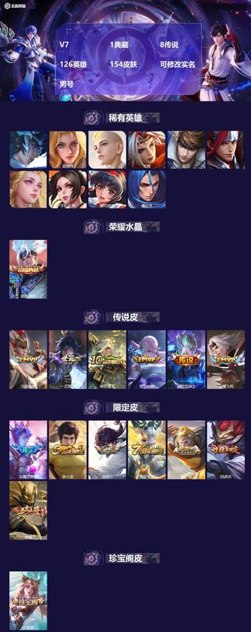 [16588898]V7 1典藏 8传说 126英雄 154皮肤 可修改实名 男号 【英雄全皮】蚩奼全皮,大禹全皮 【稀有英雄】大司命,韩信(韩跳跳),夏洛特(夏师傅),艾琳,橘右京(橘子),娜可露露(鸟人),不知火舞,赵云,金蝉(唐僧),戈娅 【荣耀水晶】弑枪猎影(韩信典藏) 【传说皮】神树通天,一念神魔,久胜战神,猫影幻舞,云鹰飞将(小将军),超时空战士-狄仁杰 【珍宝阁皮】女武神 【赛季/战令皮】古海寻踪(s33),海盐诗旅(s30),擒涛扼浪(s31),探海日志(s32),流音漫舞,顽趣-梦奇,地狱燃心,天穹祈灯(s34),蔡文姬夏日便利店,混沌棋(s18),疑决