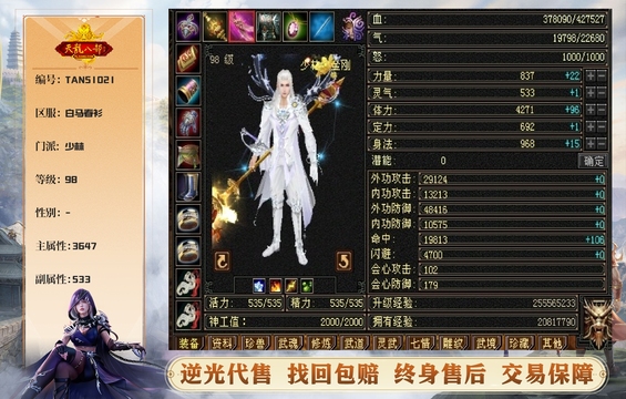 少林 | 等级:98 | 主属性:3647 | 副属性:533 | 主玄攻 | VIP0 | 畅游账号