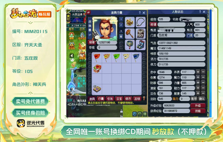 等级:105 | 五庄观,天宫,普陀山 | 无换绑CD | 180天尊享特权 | 【逆光代售卖号0手续费】【买号找回永久包赔】